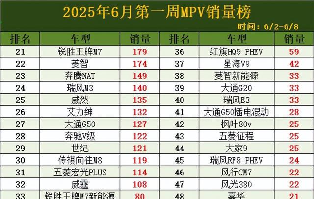 在MPV市场,销量突破1000辆的车型并不多,而一周销量能够超2000辆的车型更是凤毛麟角。最新的销量数据显示,2023年6月第一周,仅有三款车型销量破千。而更引人注意的是,在前50名中,竟有多达18款车型销量不足100辆,这显示出MPV市场的整体疲软程度。在这样的市场环境下,是什么导致了MPV这个曾经充满潜力的车型群体陷入如此困境?