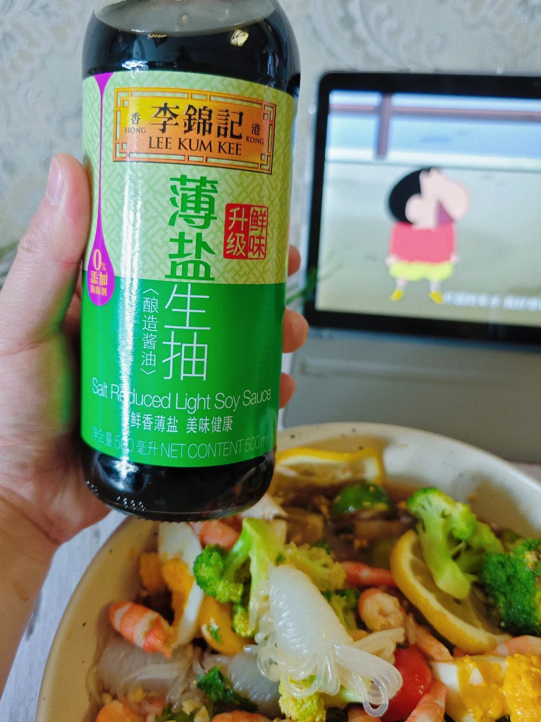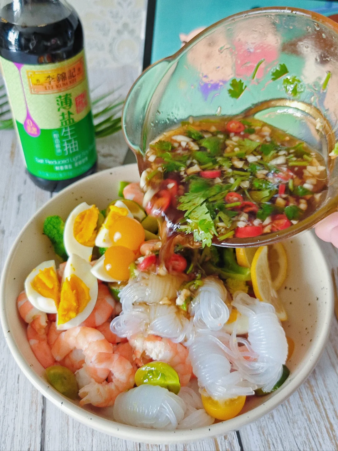 又到了夏天露腰的季节[害羞R] 减脂餐要安排起来了! · 🌵虾仁🍤魔芋丝西兰花🥦 家里简单就能做,真的好吃又开胃! · 🌵食材:新鲜虾仁🦐、 魔芋丝、西兰花🥦、小番茄🍅、柠檬🍋、鸡蛋🥚、香菜 🌵酱料:见图四 🌵做法: 1⃣️虾仁、魔芋丝、西兰花和鸡蛋煮熟。 2⃣️柠檬🍋小番茄切片摆盘 3⃣️所有食材装盘淋上酱汁搅拌即可以啦! · ⚠️:高盐的食物更容易发胖,所以酱料里没有加任何盐,用的生抽也是李锦记薄盐生抽,ta家卖的坠好的产品,0⃣️添加25%减盐,少盐但味道同样鲜美!