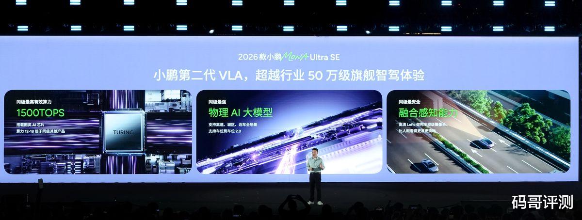 为满足不同用户的智驾需求,新车提供Max版和Ultra SE版双算力版本可选,兼顾高阶性能与实用体验,覆盖全场景出行。其中,Ultra SE版配备双图灵AI芯片,有效算力高达1500TOPS,搭载小鹏第二代VLA,这是一套面向L4时代的物理世界模型,不仅安心丝滑,全场景都能开,而且像老司机一样高效。而Max版搭载单颗图灵AI芯片,有效算力达750TOPS,目前搭载小鹏第一代VLA,2026年第三季度将开启小鹏第二代VLA蒸馏版上车,在驾驶体验、运行帧率、响应时延与稳定性等维度,完整保留小鹏第二代VLA的核心能力。
