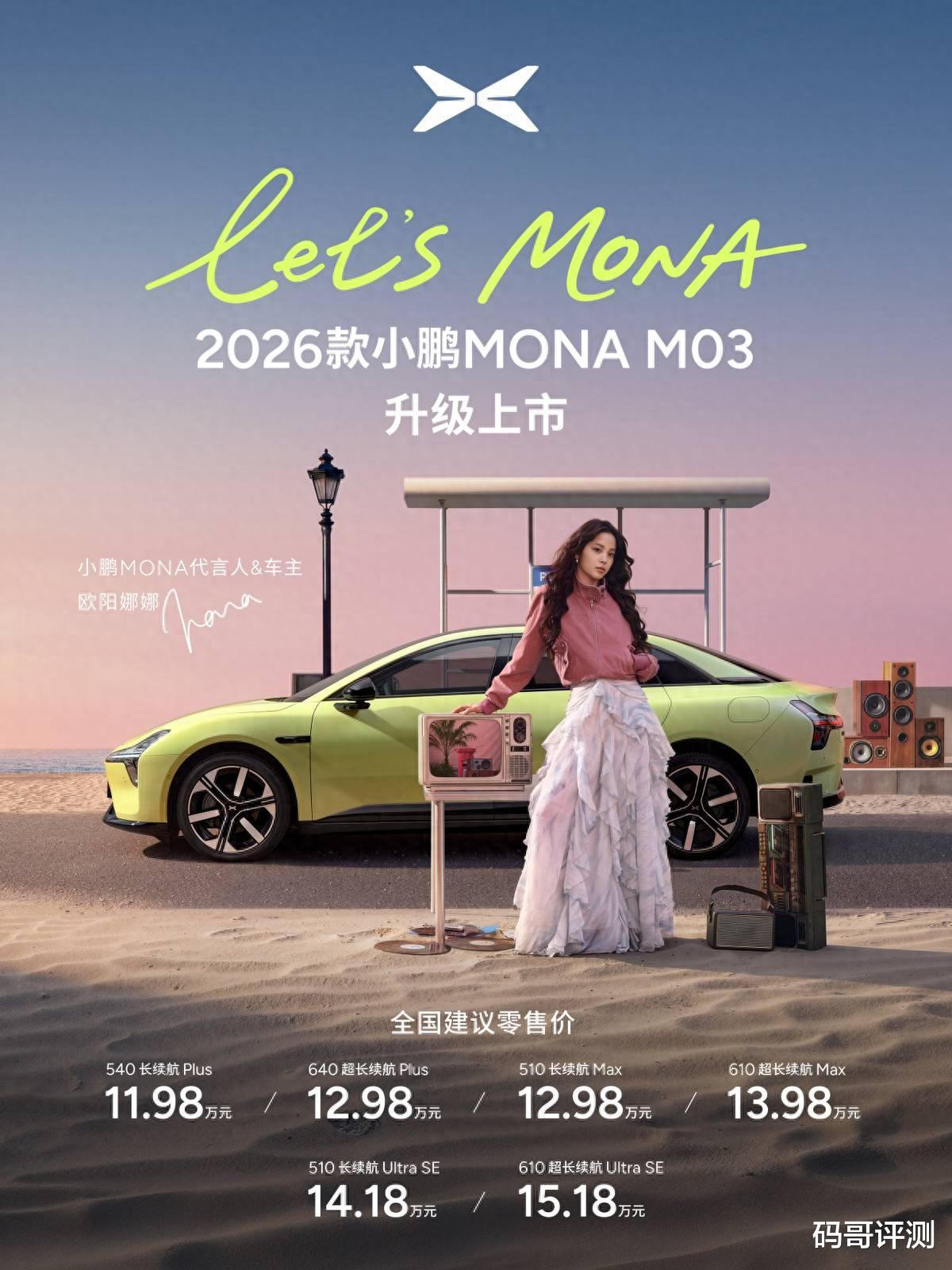 【2026年4月2日,广州】今日,2026款小鹏MONA M03正式上市。作为小鹏面向年轻用户打造的AI智能纯电轿跑,新车以“全方位对标20万级车型”为开发基准,在外观设计、智能科技、驾乘舒适与主被动安全等核心维度实现全面进化,致力于为年轻用户带来越级出众的用车体验。本次上市共推出6款版型,官方指导售价依次为:540长续航Plus 11.98万元、640超长续航Plus 12.98万元、510长续航Max 12.98万元、610超长续航Max 13.98万元、510长续航Ultra SE 14.18万元及610超长续航Ultra SE 15.18万元。品牌同步推出上市专属权益,即日起至2026年4月30日24点前下定2026款小鹏MONA M03,限时送至高价值超35,000元权益。