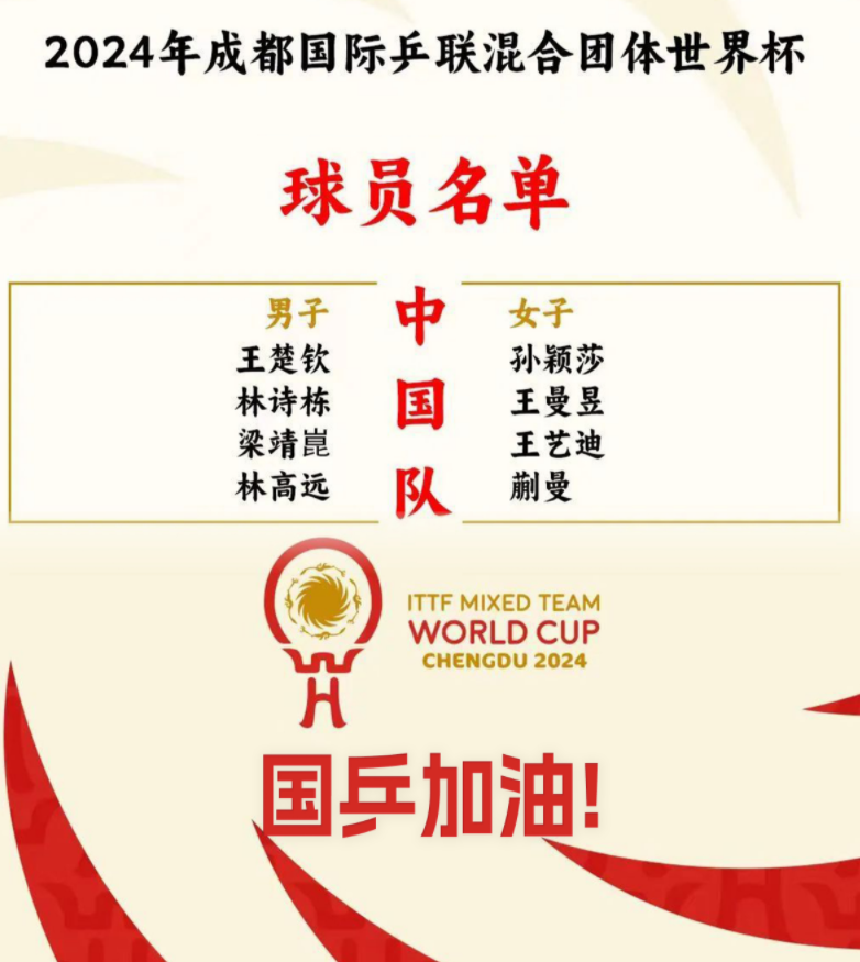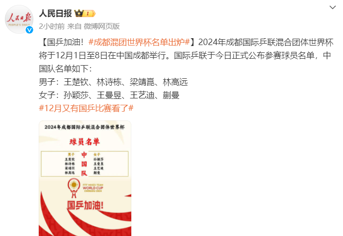 北京时间11月11日,人民日报官宣,成都混合团体世界杯名单出炉,国乒8名球员参赛,包括4男4女,分别是王楚钦、林诗栋、梁靖崑、林高远、孙颖莎、王曼昱、王艺迪、蒯曼。