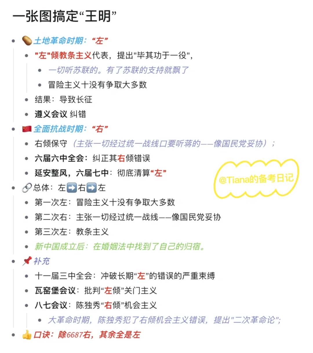 🥔土地革命时期:【“左”】 ▪️"左"倾教条主义代表,提出"毕其功于一役", (一切听苏联的。有了苏联的支持就飘了) 冒险主义十没有争取大多数 ️▪️结果:导致长征 ▪️遵义会议 纠错 🇨🇳全面抗战时期:【“右”】 ▪️右倾保守(主张一切经过统一战线口要听蒋的一—像国民 觉妥协); ▪️六届六中全会:纠正其右倾错误 ▪️延安整风,六届七中:彻底清算【“左”】 🌟总体:左➡️ 右 ➡️左 ▪️第一次左:冒险主义十没有年取大多数 ▪️第二次右:主张一切经过统一战线一一像国民党妥协 ▪️第三次左:教条主义 新中国成立后:在婚姻法中找到了自己的归宿。😌 📌补充 ▪️十一届三中全会:冲破长期“左”的错误的严重束缚 ▪️瓦窑堡会议:批判“左倾”关门主义 ▪️八七会议:陈独秀“右倾”机会主义 👄口诀:除6687右,其余全是左❗️