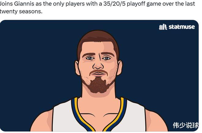 首先,约基奇是除了字母哥之外,唯一一位能够在最近20个赛季的季后赛中单场轰下35分20篮板5助攻的球员。