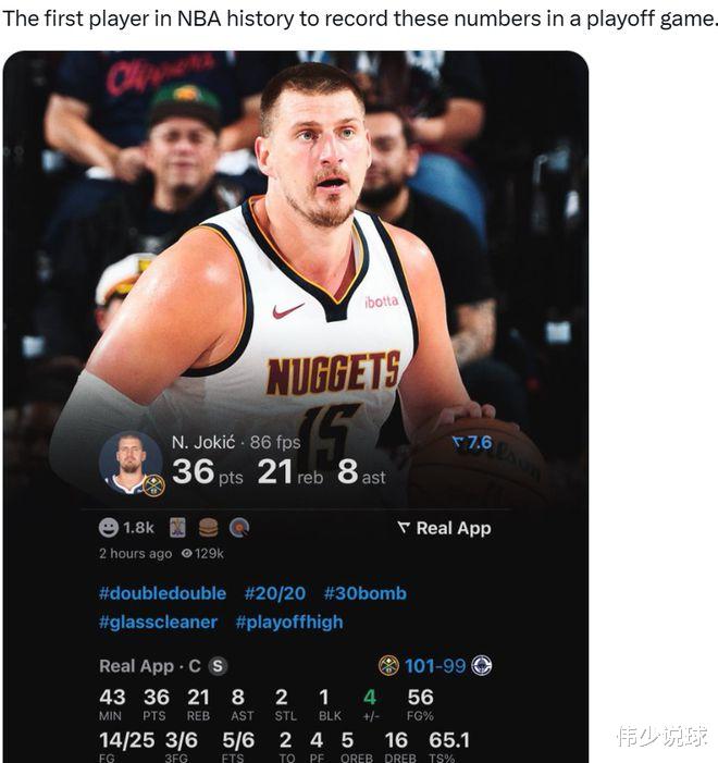 第二,约基奇也是NBA历史上首位能够在季后赛单场轰下36分21篮板8助攻的球员。