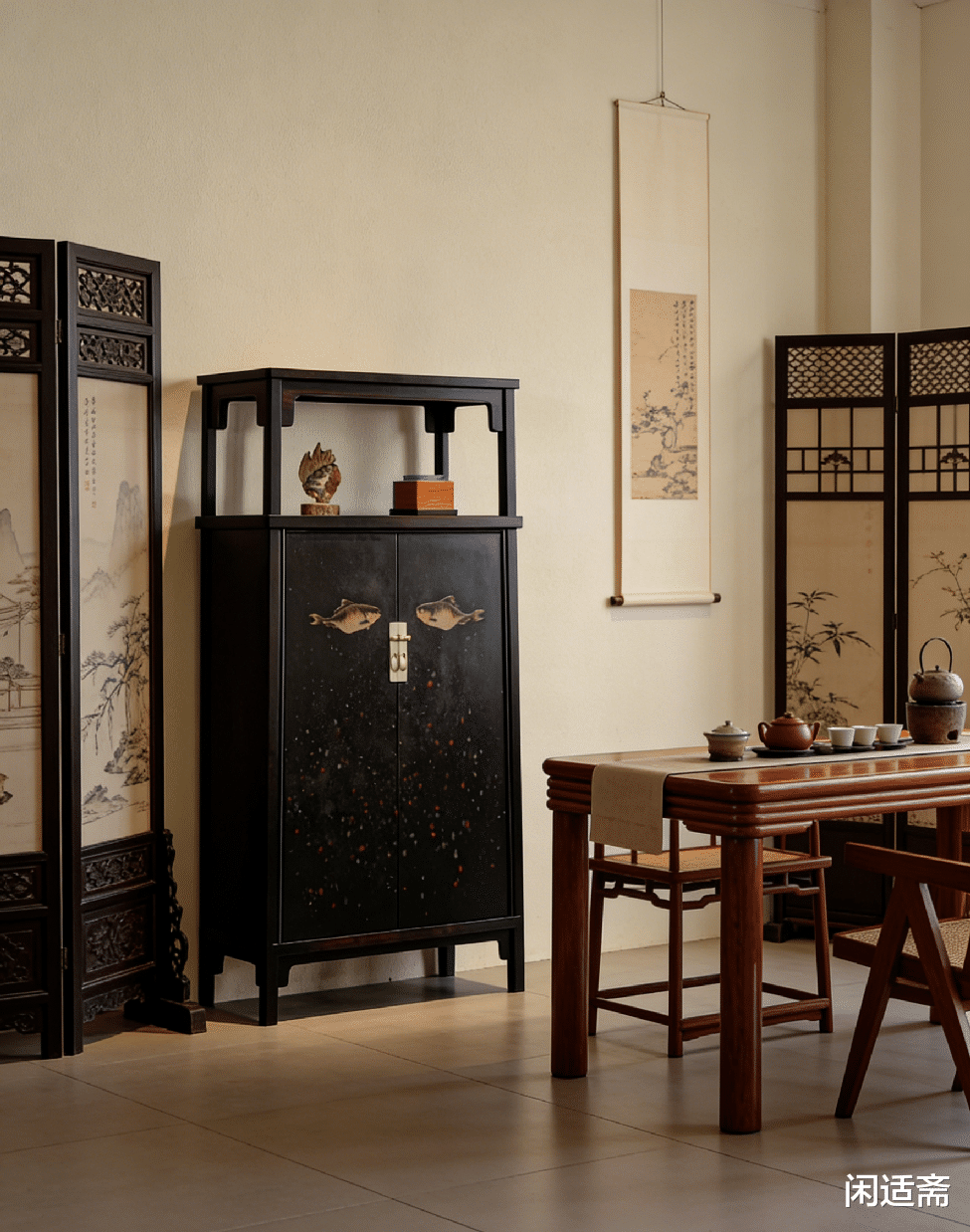 中式家具的高阶美学,在于以器为媒,融合材质之韵、工艺之精与文人之思。这款紫光檀亮格柜,以紫光檀沉敛质地为骨,以古法大漆技法为衣,将八大山人经典鱼纹晕染于柜面,打破家具与文人画的界限,既有中式家具的形制之美,又藏文人画的空灵意境,摆于文房、茶室、厅堂,便是东方美学最动人的具象表达,兼具实用、艺术与收藏价值。
