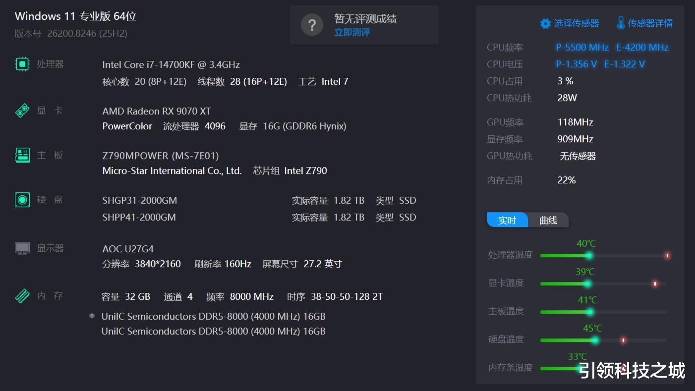 测试主机核心配置采用14代酷睿i7-14700KF+RX 9070 XT 16GB组合,主要瞄准的是2K这个级别。内存方面则是墨云藏境DDR5 8000 C38 32GB(16GB*2),由于官方推荐16GB起步,所以本次测试也会进行32GB双通道与16GB单通道的横向对比。