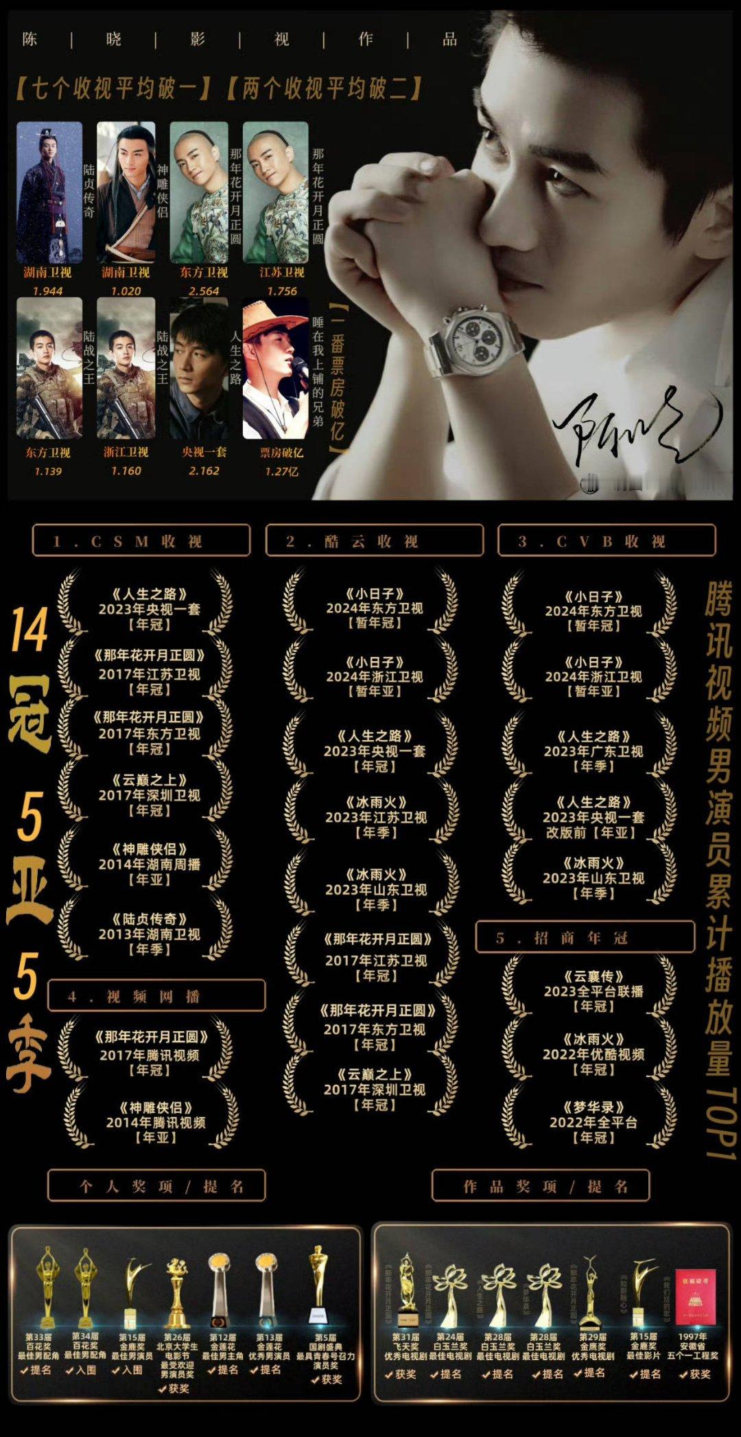 #明星实绩# 陈晓的实绩乍一看满满当当,实际上没有飞天金鹰白玉兰视帝提名,更不用说拿奖。陈晓已经37岁了,应该把心思放在拿视帝上。