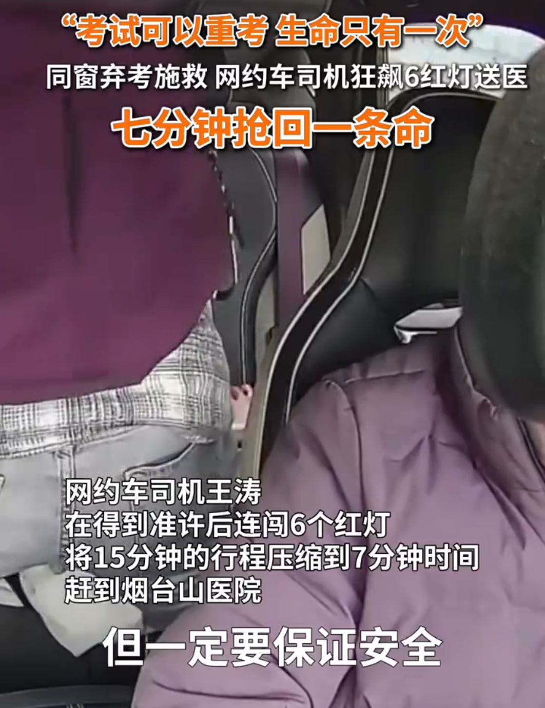 姜昭鹏没有丝毫犹豫,立刻运用在学校急救课上学到的知识,对发病同学持续进行心肺复苏、人工呼吸等急救措施。与此同时,网约车司机王涛也迅速做出反应,他一边对车上两位学生进行安抚,一边联系交警说明车内的紧急情况,在得到准许后连闯 6 个红灯,将原本 15 分钟的行程压缩到 7 分钟时间,紧急驶向烟台山医院。