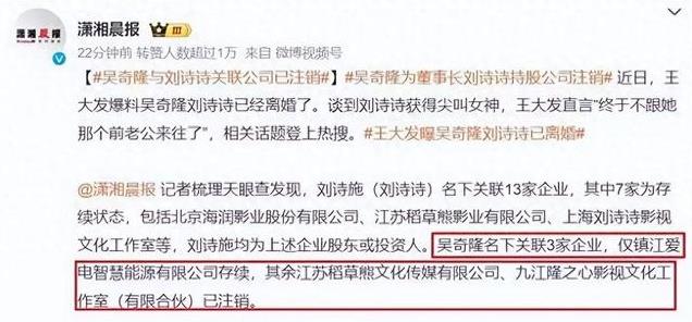 吴奇隆和刘诗诗的爱情故事始于《步步惊心》的热播,那时的他们如同童话中的王子与公主,婚礼奢华,甜蜜满溢。随着时间的推移,这对璧人开始面临各种考验。最近一次离婚传闻的兴起,并非毫无缘由。王大发在直播间的爆料就像一颗投入平静湖面的石子,瞬间激起千层浪。网友们发现他们关联的公司注销,这其中还包括和刘诗诗共同关联的江苏稻草熊文化传媒公司。在大众的认知里,夫妻间关联公司的变动很容易与婚姻关系联系起来,仿佛这就是离婚的前奏。