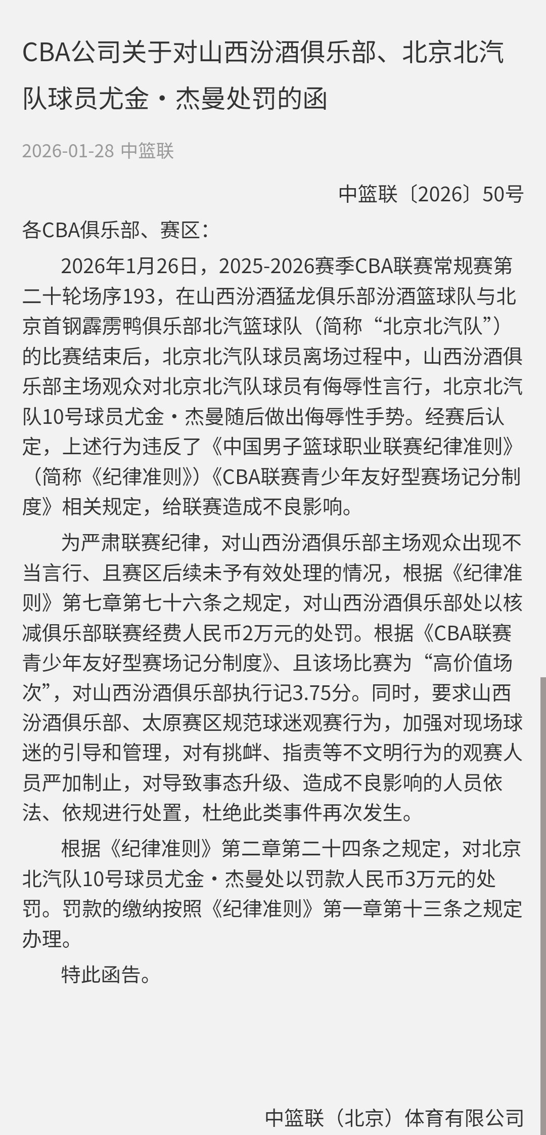 首先来看罚款,CBA官方发布声明:在山西男篮跟北京首钢男篮的比赛结束后,北京队球员离场过程中,山西主场观众对北京北汽队球员有侮辱性言行,北京队1球员尤金·杰曼随后做出侮辱性手势。