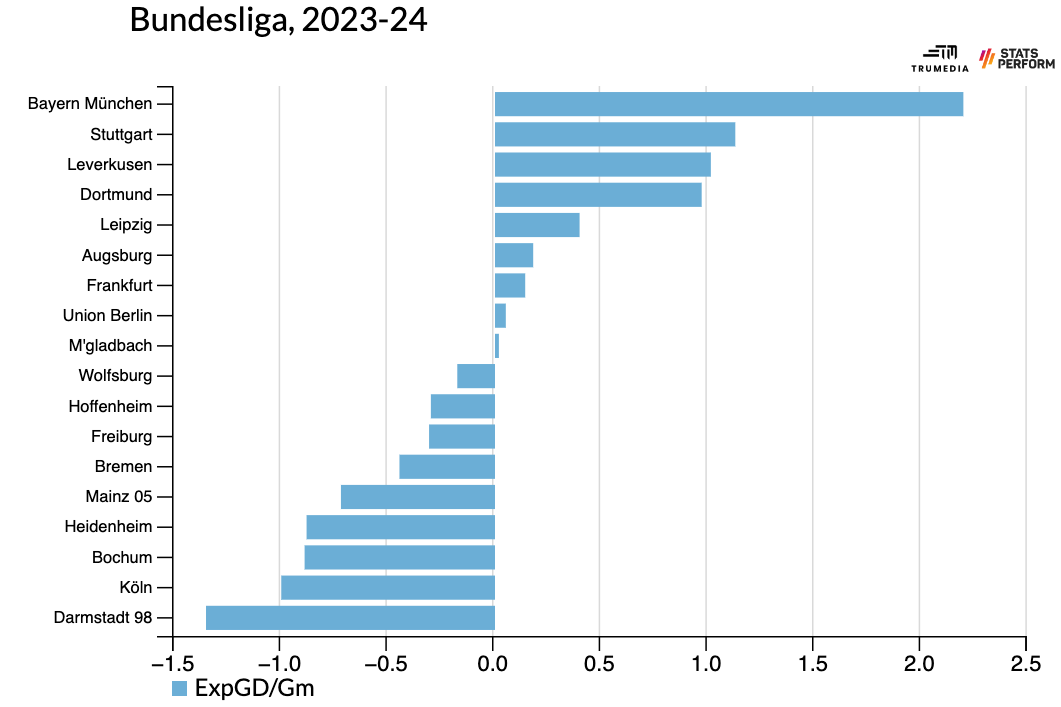 拜仁应该每个赛季都有最好的进球和预期进球差——这是他们相对于联赛其他球队在财务优势上的本质。根据FBref的估计,他们的工资账单是多特蒙德第二大德甲工资单的两倍。