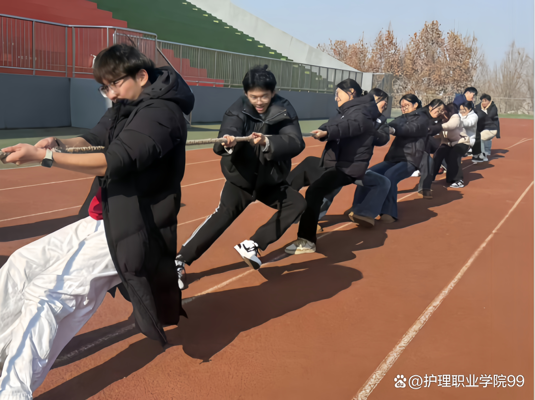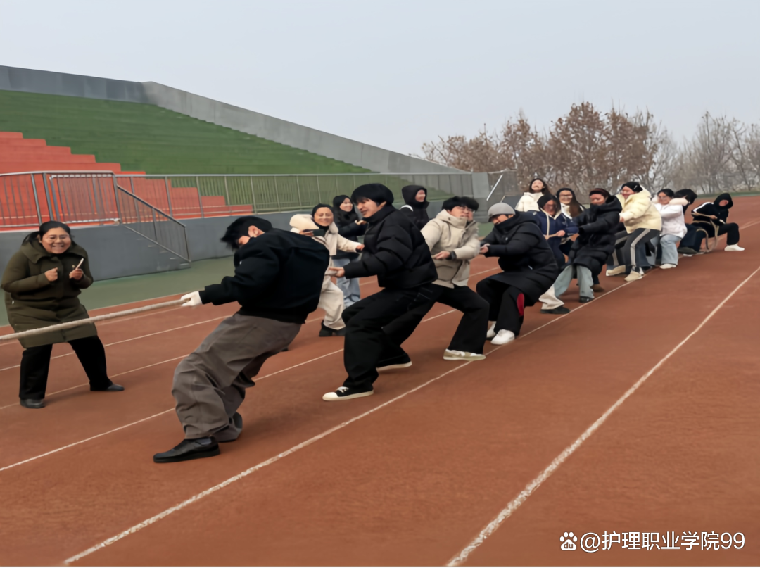 赛场气氛热烈,师生互动环节将活动推向高潮。老师与同学们同场竞技,一根粗麻绳连接起讲台内外的深情。哨声响起,双方顿时发力——老师们沉着稳健,腰背绷出坚韧的弧线,展现护理人踏实严谨的作风;学子们则朝气蓬勃,口号响亮、步伐扎实,青春的活力驱散了冬日微寒。麻绳紧绷,红绸带在中线反复拉锯,每一次移动都引来场边阵阵欢呼。