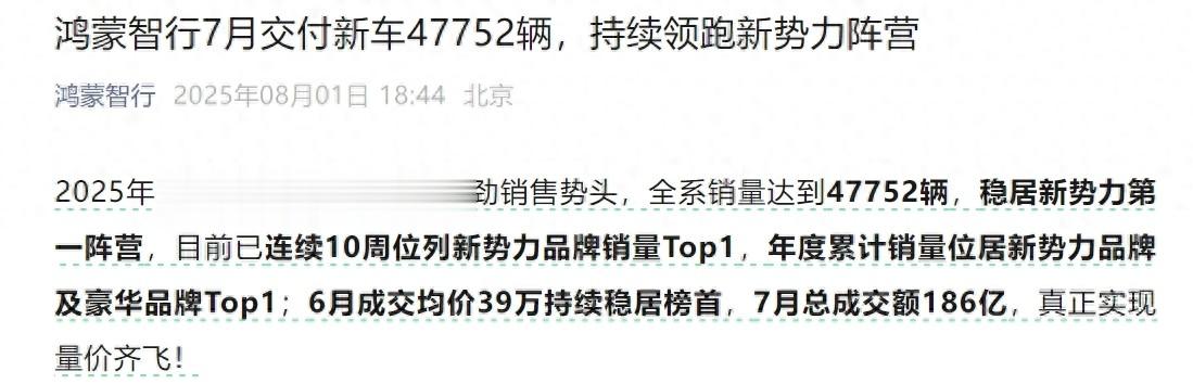 2025年8月初,鸿蒙智行发文称,2025年7月鸿蒙智行全系销量达到47752辆,7月总成交额186亿元。