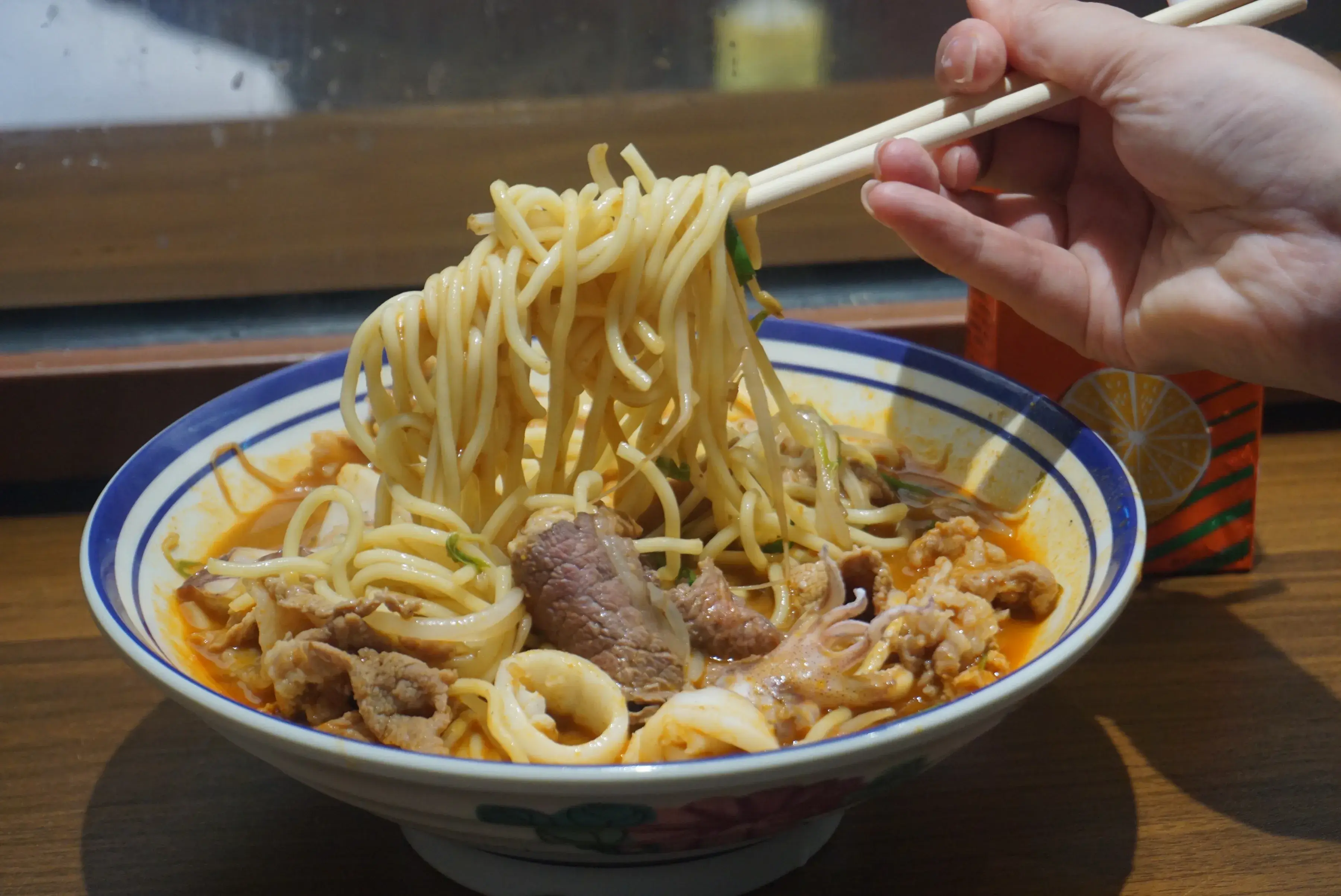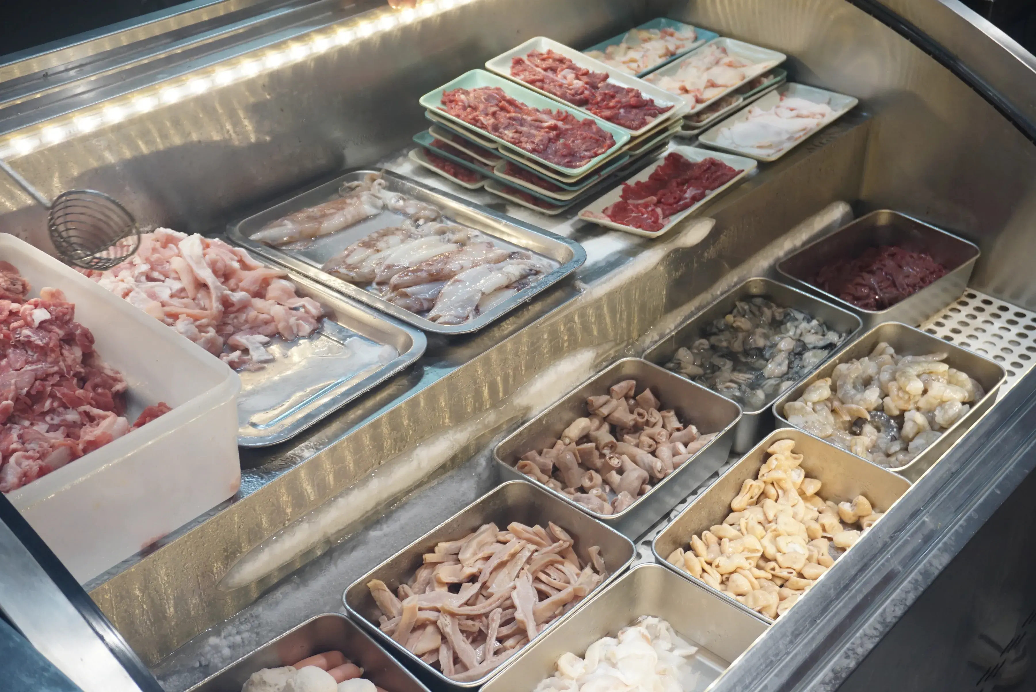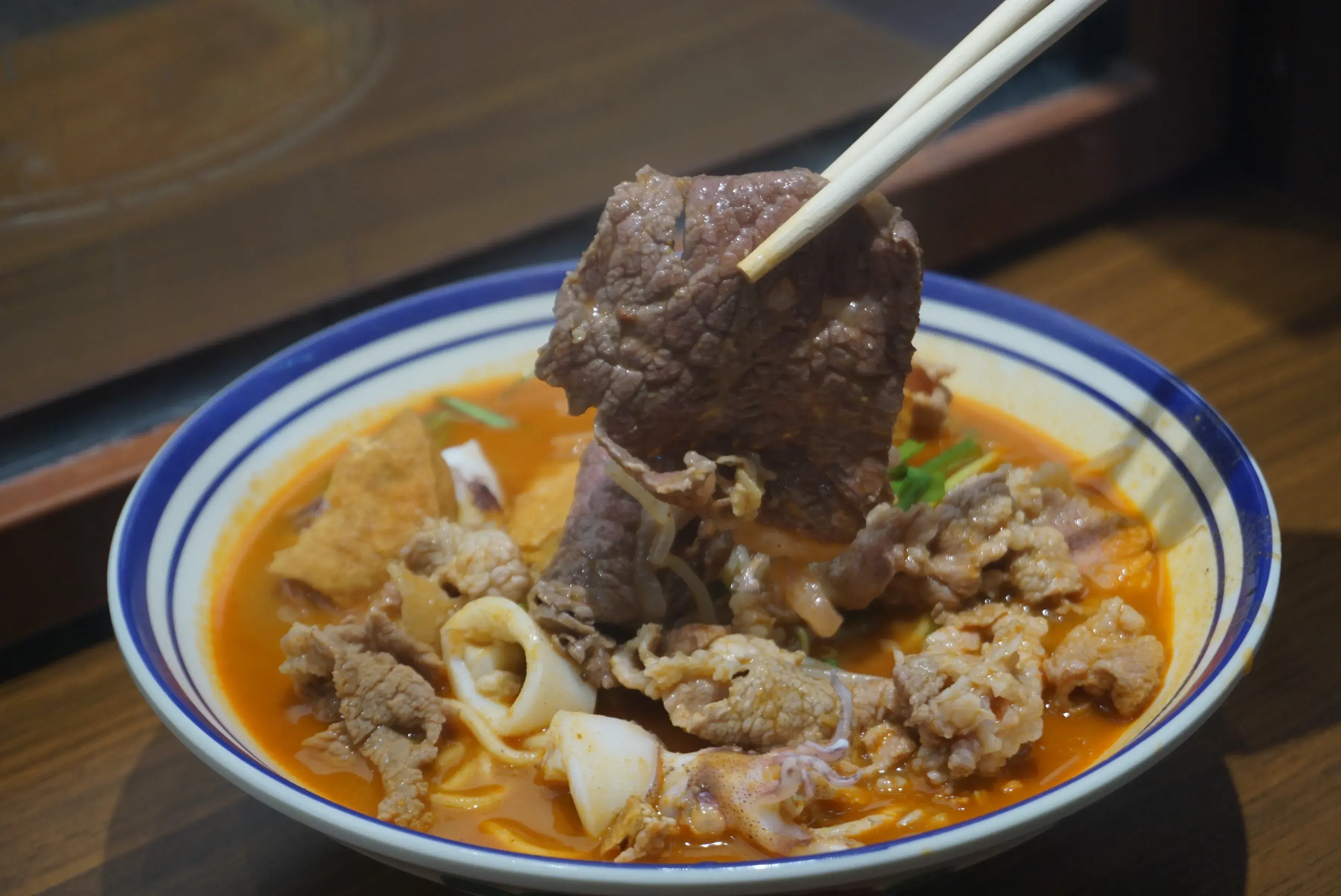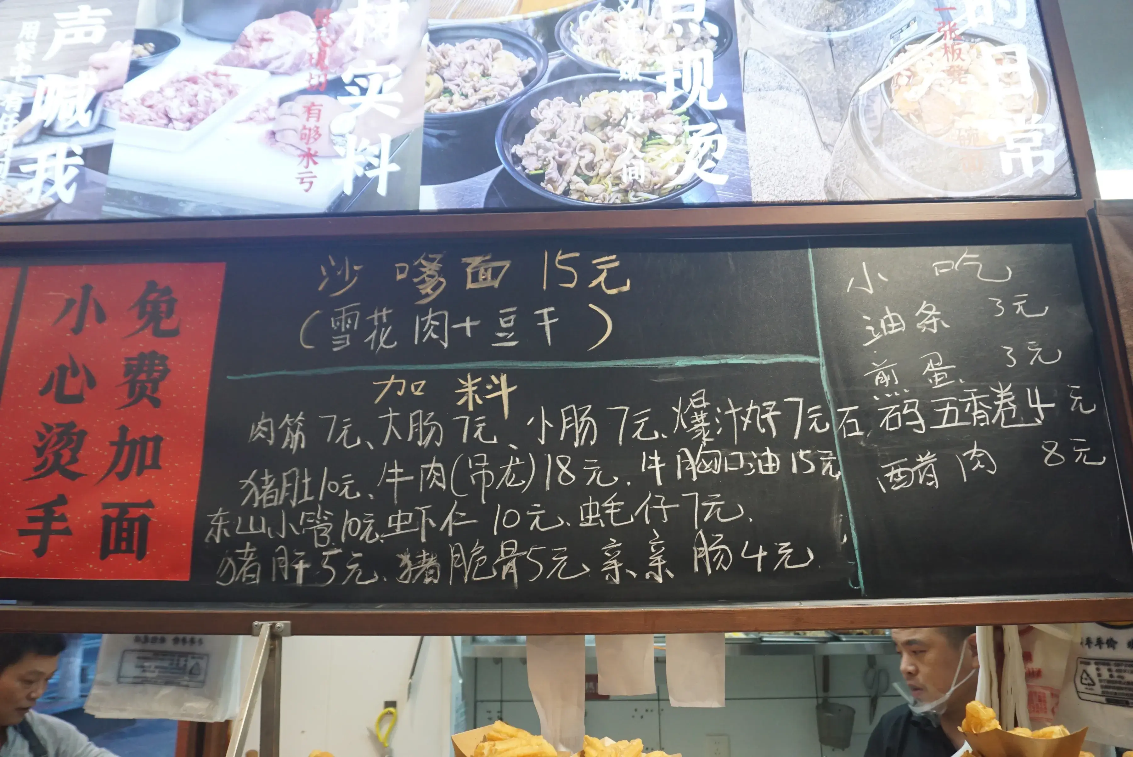 东山小管、吊龙牛肉、新鲜虾仁、肉筋、大肠、牛胸口油、猪肚、蚝仔、猪肝等等都是沙嗲面里加料的好搭配!选好喜欢自己吃的食材之后,就看着老板把各种好料快速的在沙嗲汤里涮烫,生滚出来的肉肉可是保留着鲜嫩的口感啊!