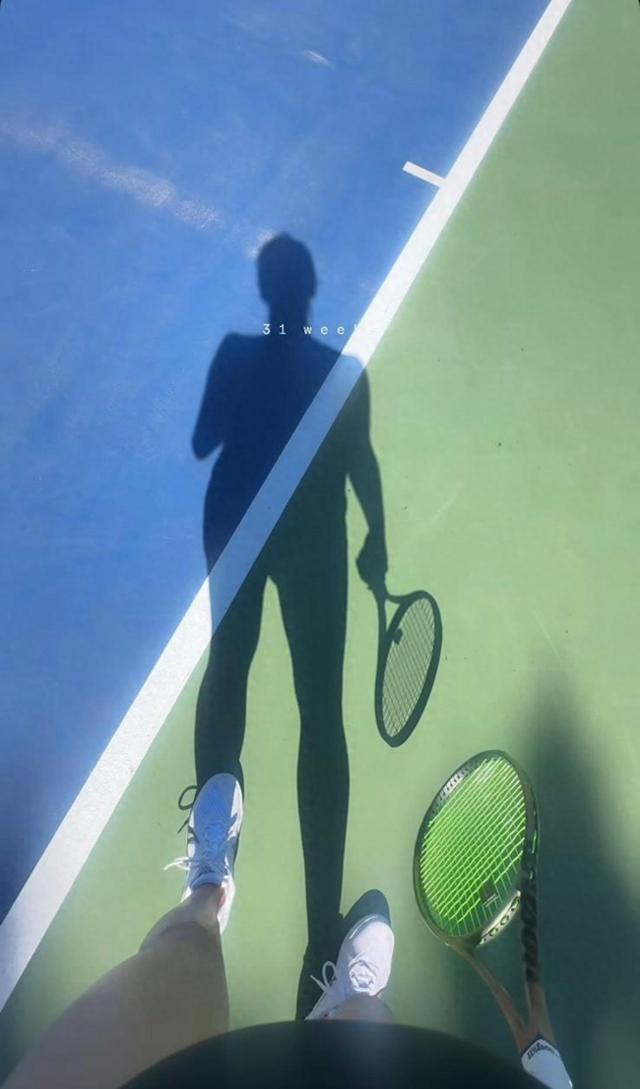 谢婷婷现身网球场,不是来观看比赛,而是亲身上阵打网球。她没有晒出正脸照,而是通过半身照以及影子的方式公开了近况。她穿了网球短裤裙以及球鞋,当天太阳更应该不小,所以站在哪个角度都能照射出影子。谢婷婷拿着网球拍在球场上做准备运动,其中一张照片还是她挺着大肚子拍的,从照片可见,影子中的肚子已经又大又圆,连影子都显得凹凸有致。