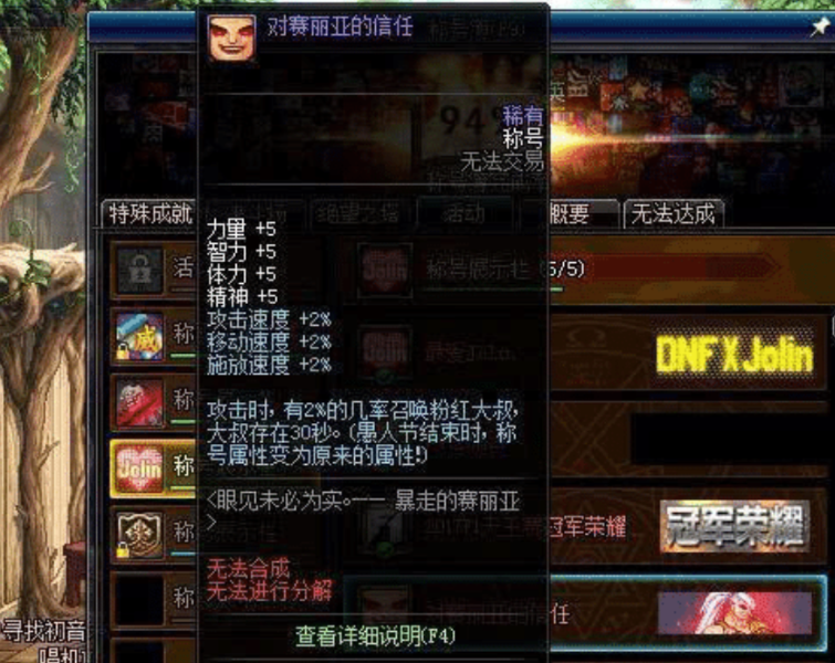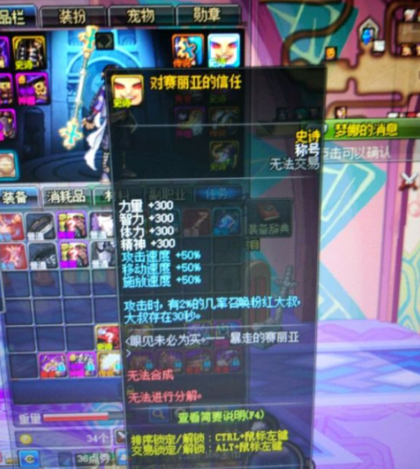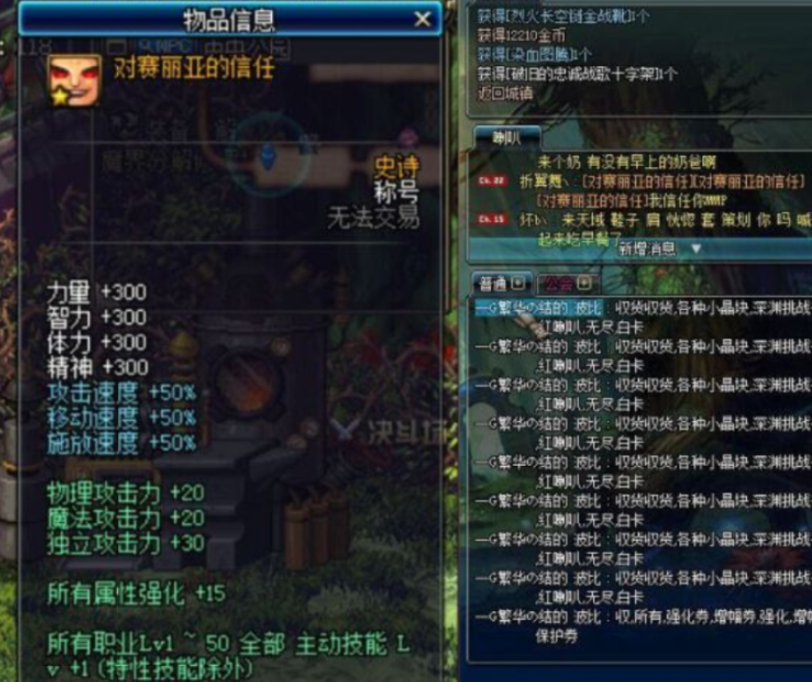 虽然说这游戏更新到现在这个版本,这游戏的至尊称号的属性也是非常强的,但相比于这个史诗称号来说还是比不上的。这个叫做对赛丽亚的信任的史诗称号的属性是真的强,四维属性加了足足300点,三速也是增加了有50%。