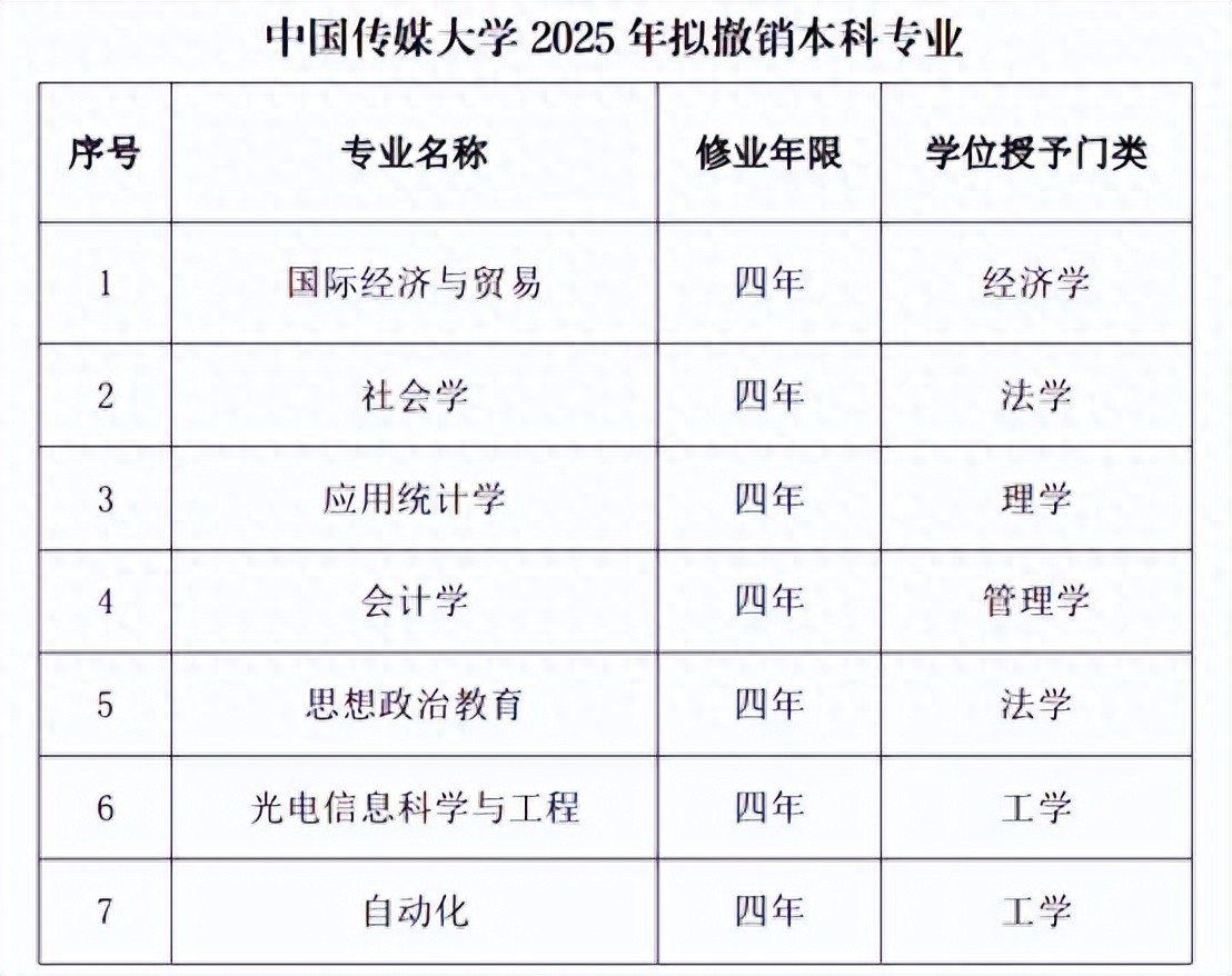 2025年8月,中国传媒大学发布2025年度本科专业设置情况公示。名单显示,2025年度中国传媒大学拟撤销国际经济与贸易、社会学、应用统计学等7个本科专业。