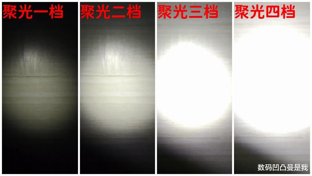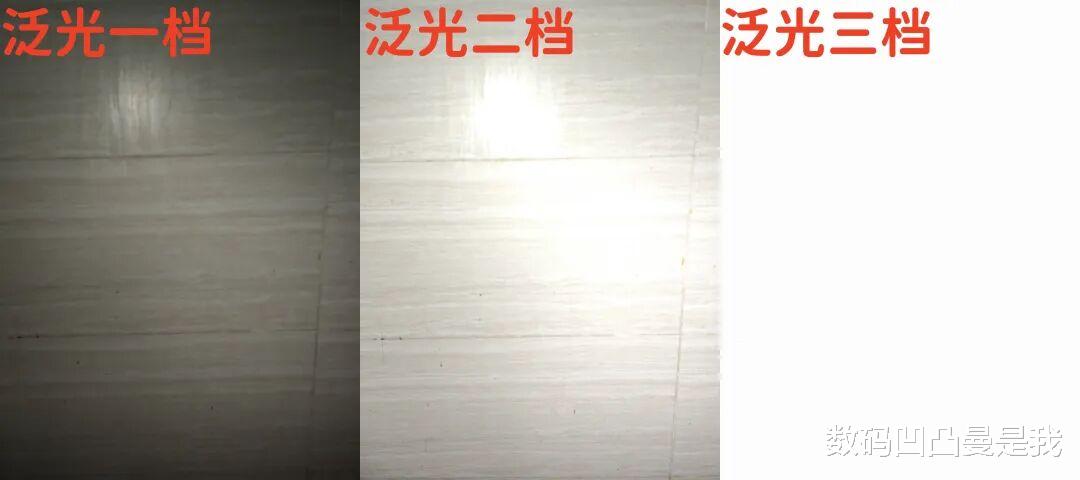上图是相同照明距离和手机参数下拍的聚光四档亮度的变化,可以看到即便是低亮度下也可以满足小范围的照明,处于高亮度时便完全处于过曝状态,下图泛光模式三档的情况也一样。