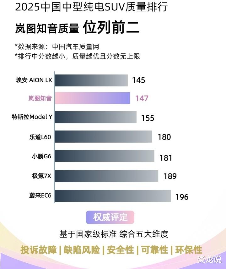 当宝马iX3还在为“豪华纯电SUV”标签较劲时,一款国产车型的横空出世,彻底搅动了20万级市场的格局。近日,中国汽车质量网发布的《2025年第一季度新能源中型SUV质量排行榜》显示,岚图知音以黑马姿态冲入前三,力压特斯拉Model Y和宝马iX3,成为榜单上排名最高的中国自主品牌车型。