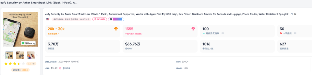 最先火起来的是一款售价16.9美元的蓝牙定位器,用来防止丢东西的,大小和功能跟苹果的AirTag几乎一模一样,但价格只有AirTag的一半。在亚马逊上,它也表现得相当不错。