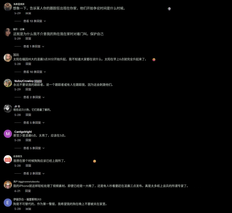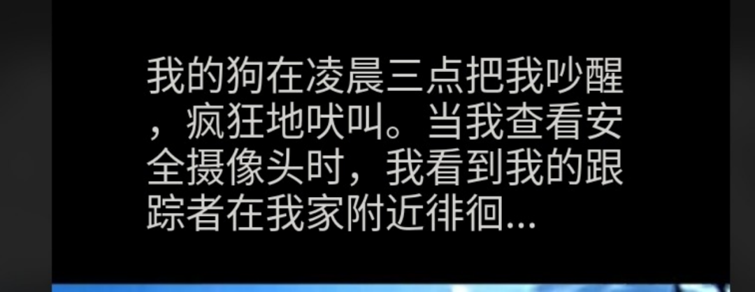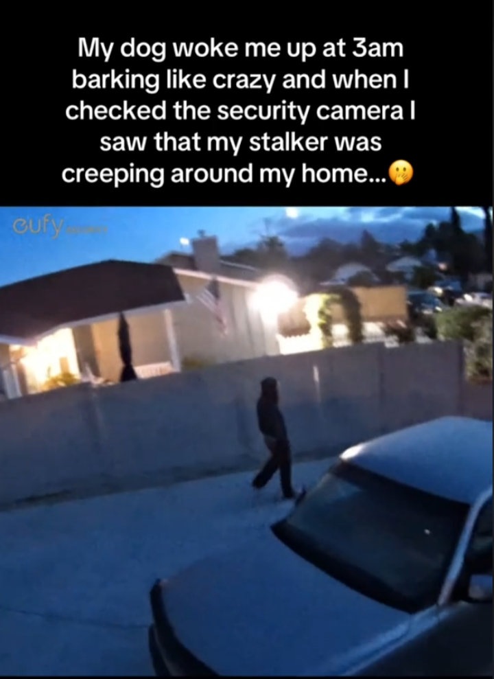 配图的文案是:凌晨3点,我的狗狂叫把我吵醒。我查看了监控摄像头,发现跟踪者正在我家附近徘徊……