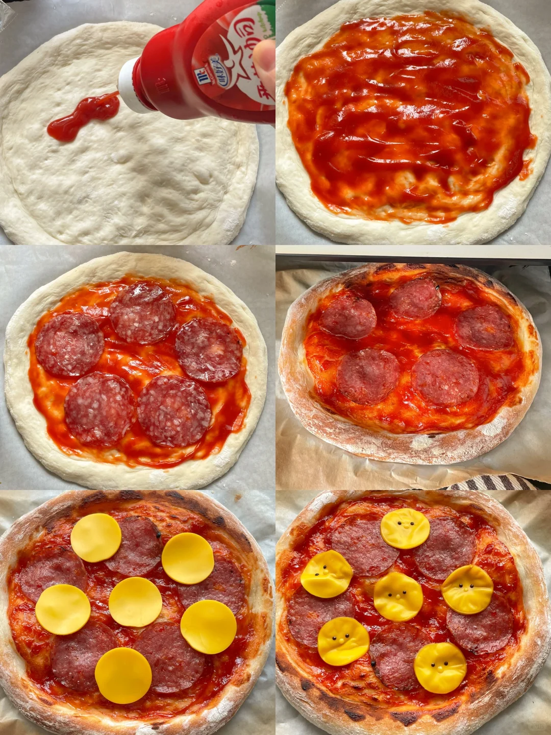6️⃣发酵好的面团裹满面粉,用手将面团从里往外延展开面团,整好后挤上满满的番茄酱,铺上萨拉米,送入烤箱230度上下火烤10分钟