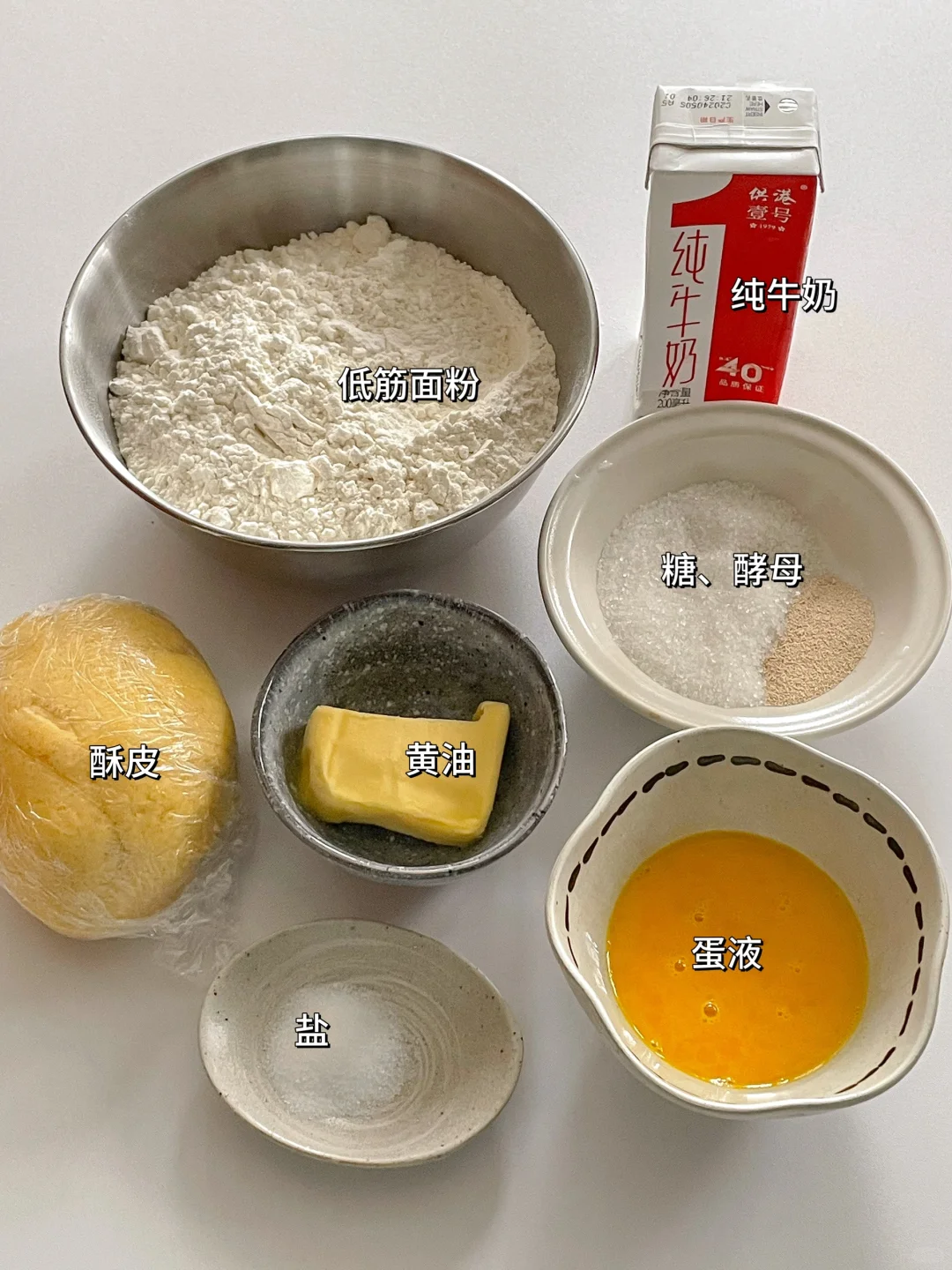 🧈酥皮:软乎的黄油60g、糖50g、常温全蛋液25g、奶粉15g、低粉110g、泡打粉2g