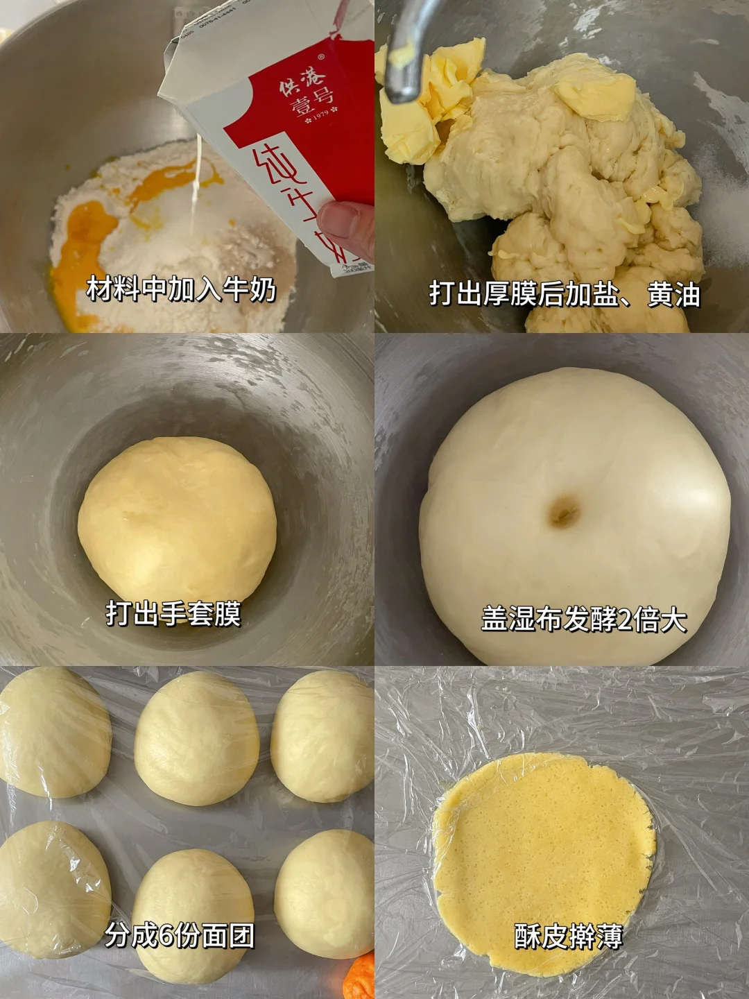 1️⃣除黄油和盐外,其余材料加入到厨师机中,低速混合均匀中高速打出厚膜状态后加入盐和黄油,低速混合均匀高速打至出手套膜