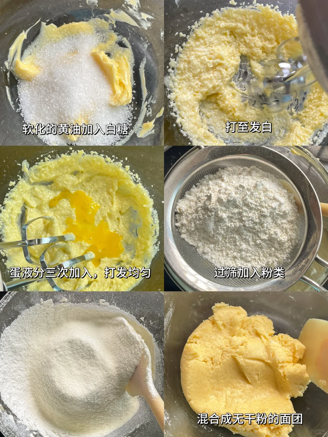 3️⃣发酵期间就来做酥皮,软化的黄油加入白糖混合均匀,用打蛋器打到微微发白,分三次加入蛋液,打至融合后,过筛加入粉类,用刮刀混合到无干粉状态时,包上保鲜膜放入冰箱冷藏松弛