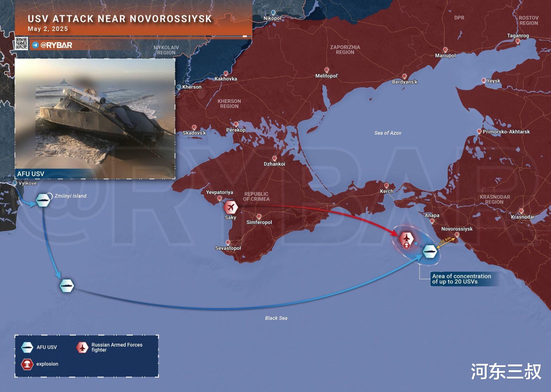 事件发生在5月2日,当天晚上乌克兰出动超过30艘各型“星链”无人艇,以及大量陆基起飞无人机,袭击黑海城市新罗西斯克港。这些无人艇还包括无人母舰,以及防空无人艇两种,配备自杀式无人机,和空空导弹两种版本。在抵达攻击海域后,发射无人机进行突袭作战,这种攻击本身就很隐蔽,俄军战斗机和武装直升机只能紧急升空拦截。