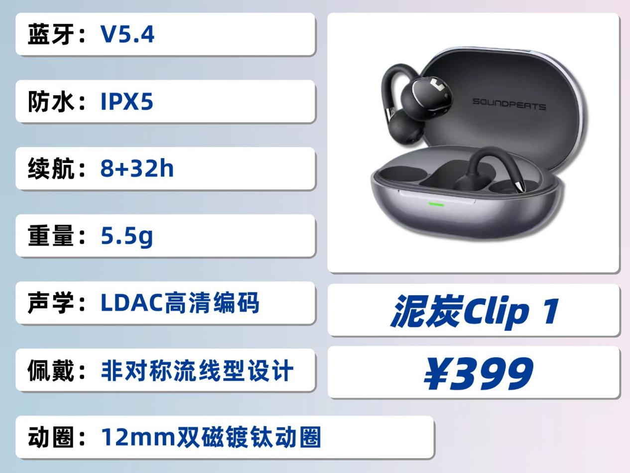 泥炭 Clip1 运用仿生弧度人体工学设计,单耳轻至 5.5g,搭配柔软亲肤的硅胶耳垫,重量分配更合理。C 形钛合金支架韧性适中,能够适配不同耳型,日常办公、外出通勤都能佩戴稳固。耳机搭载 12mm 双磁镀钛振膜动圈单元,结合品牌自研的动态均衡调音算法,三频衔接顺滑,中高频解析力表现优秀。同时支持 LDAC 高清编码与杜比音效,音乐细节还原充足,声场宽广且立体感强。