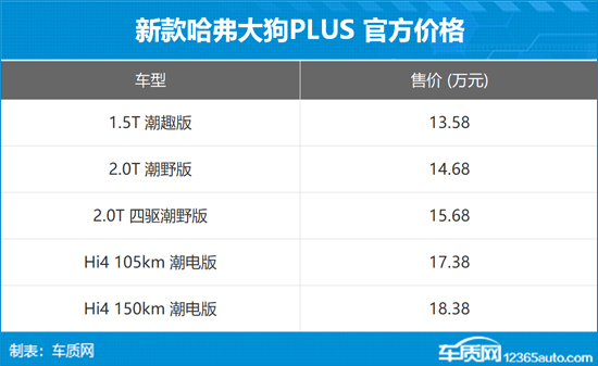 2025年9月15日,新款哈弗大狗PLUS正式上市,新车共推出5款配置,售价区间为13.58-18.38万元,限时售价10.98-15.78万元。新车依旧定位为中型SUV,主要针对外观进行调整,燃油版车型提供1.5T和2.0T发动机,PHEV车型提供1.5T Hi4四驱电混系统。