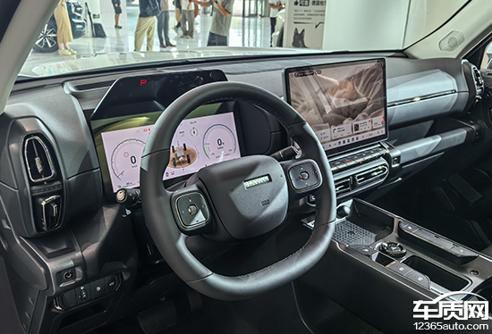 内饰还是熟悉的样子,整体采用了比较硬派的设计风格。中控台造型层次分明,搭配双辐式方向盘,整体感觉清爽干练。配置部分,新车依旧搭载12.3英寸全液晶仪表以及14.6英寸悬浮式中控屏,屏幕下方保留了一排物理按键,日常操作简单方面。值得一提的是,由于新款车型改为了怀挡式设计,因此副仪表台处的空间得到了进一步释放。