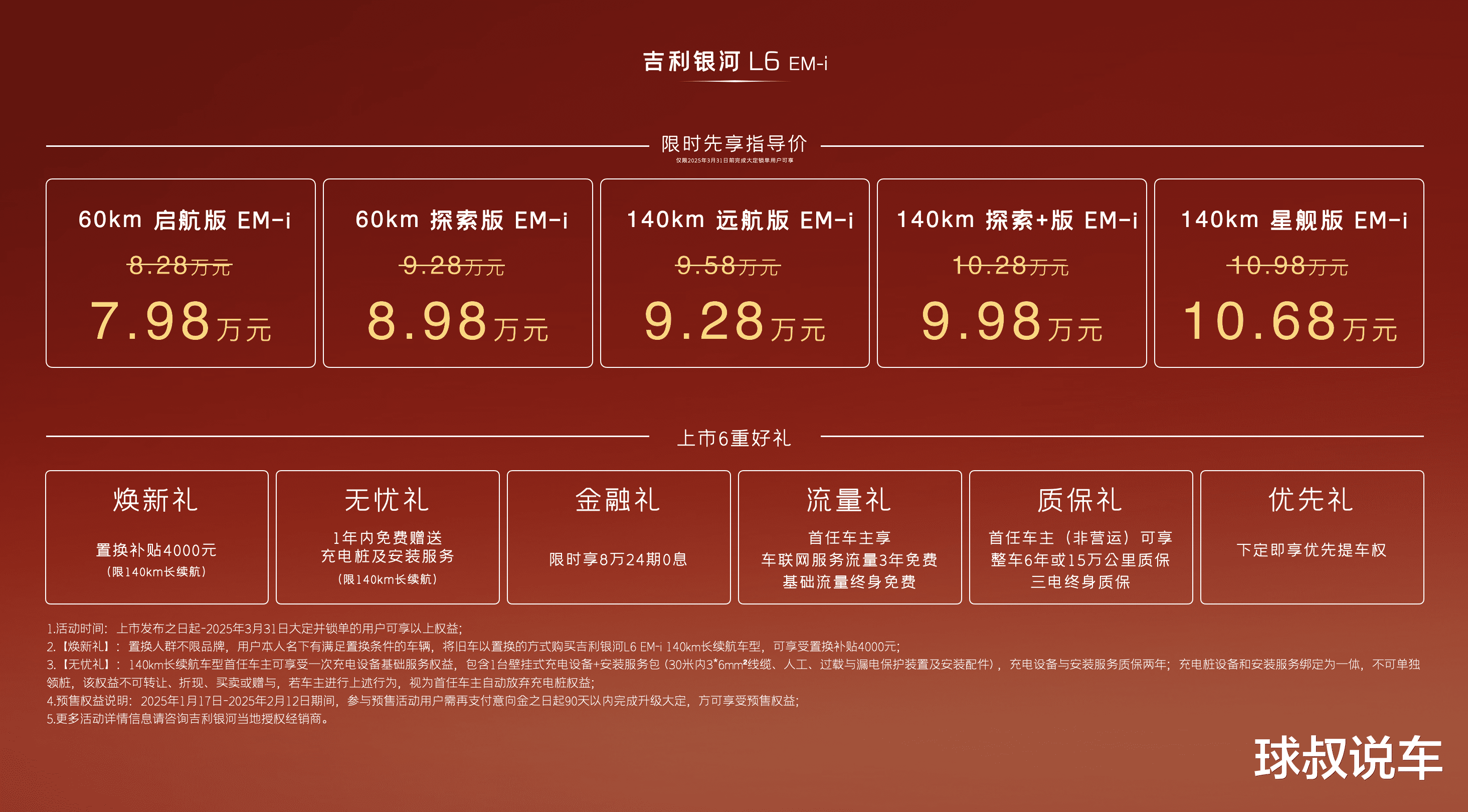 2025年2月12日,吉利汽车旗下的银河L6 EM-i正式上市,限时先享指导价区间为7.98-10.68万元,这一价格区间相比此前预售价有所下调,为消费者带来了不小的惊喜。作为雷神EM-i超级电混的首款轿车,银河L6 EM-i在节能、智能、设计三大方面焕新体验,树立了A级电混家轿价值新标杆。