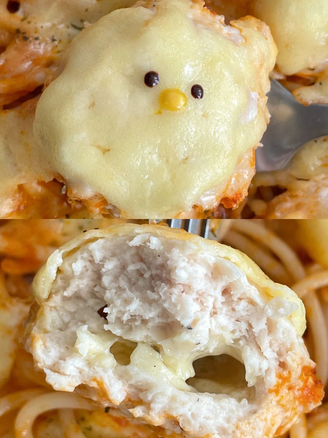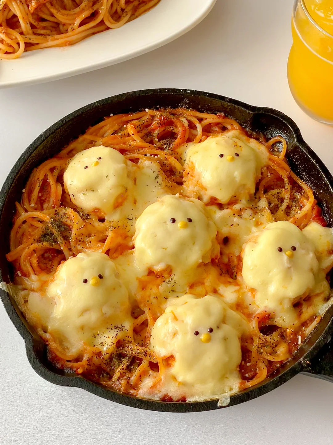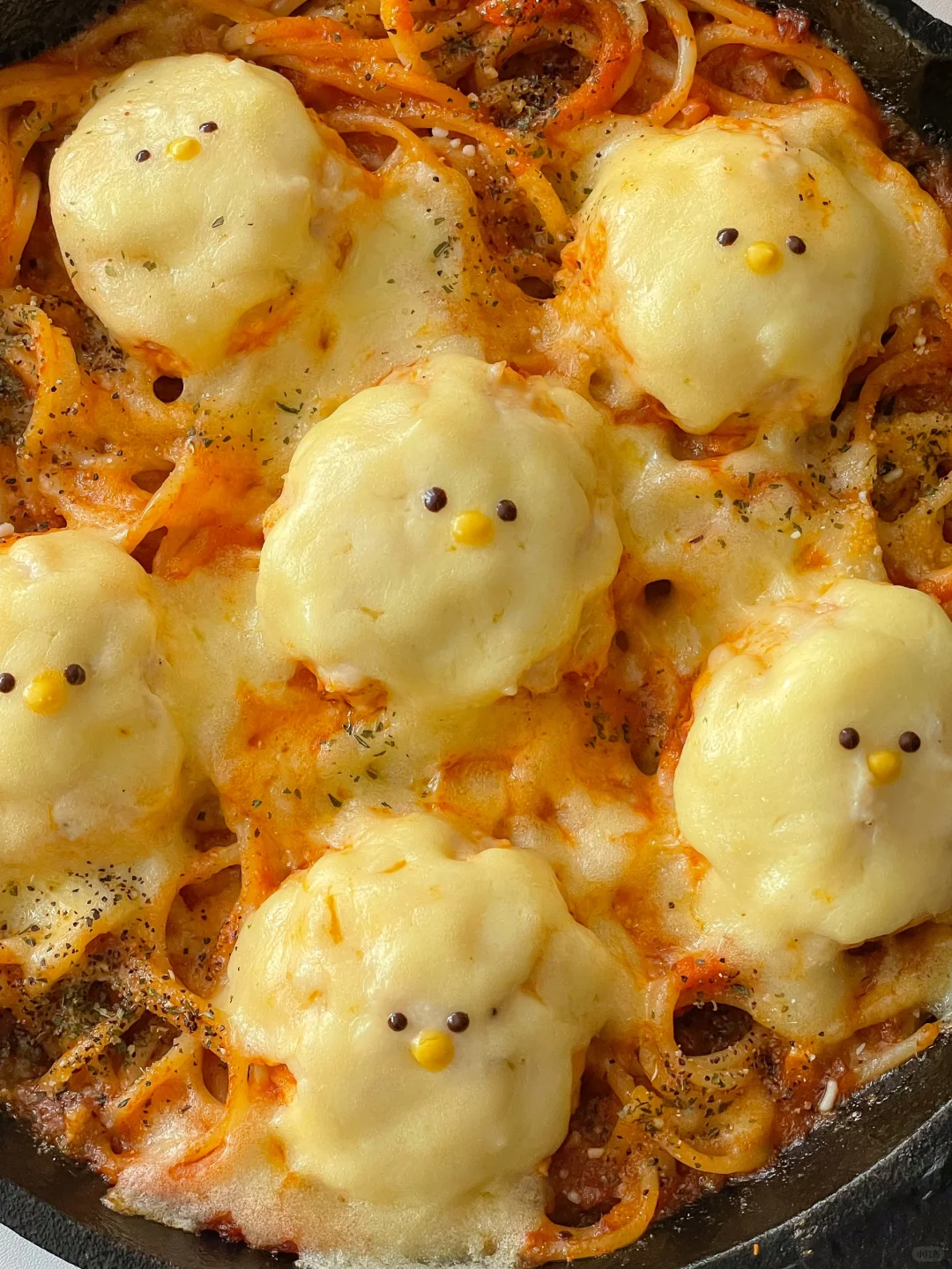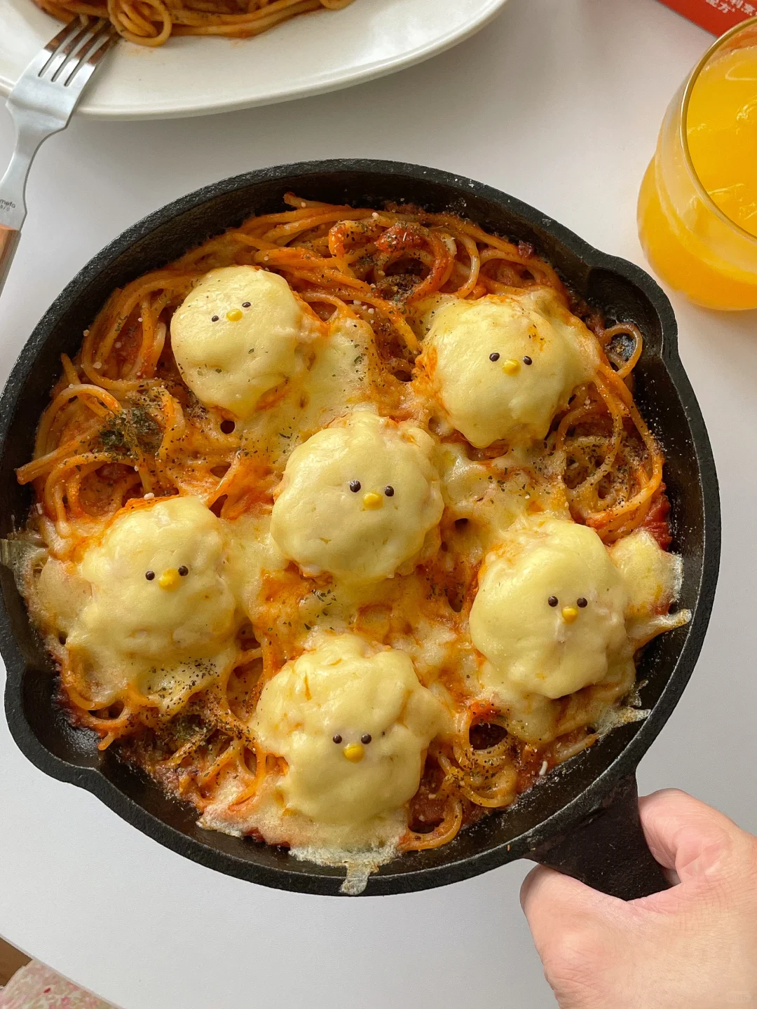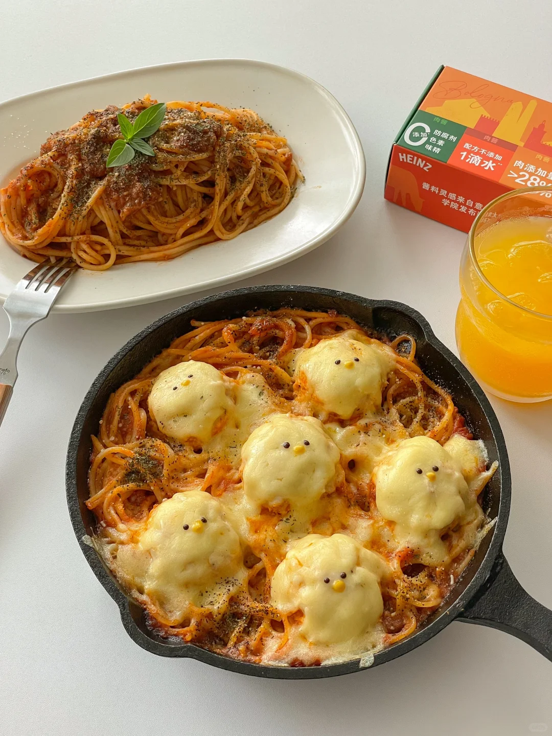 3️⃣铸铁锅里加入番茄丁炒到软烂,加入煮好的意面和番茄肉酱包,倒入适量清水,将鸡肉丸挨个放上去,盖上盖子先焖5分钟,然后撒上芝士盖上盖子再焖3分钟,用黄芥末酱和蚝油画上小鸡表情就可以啦