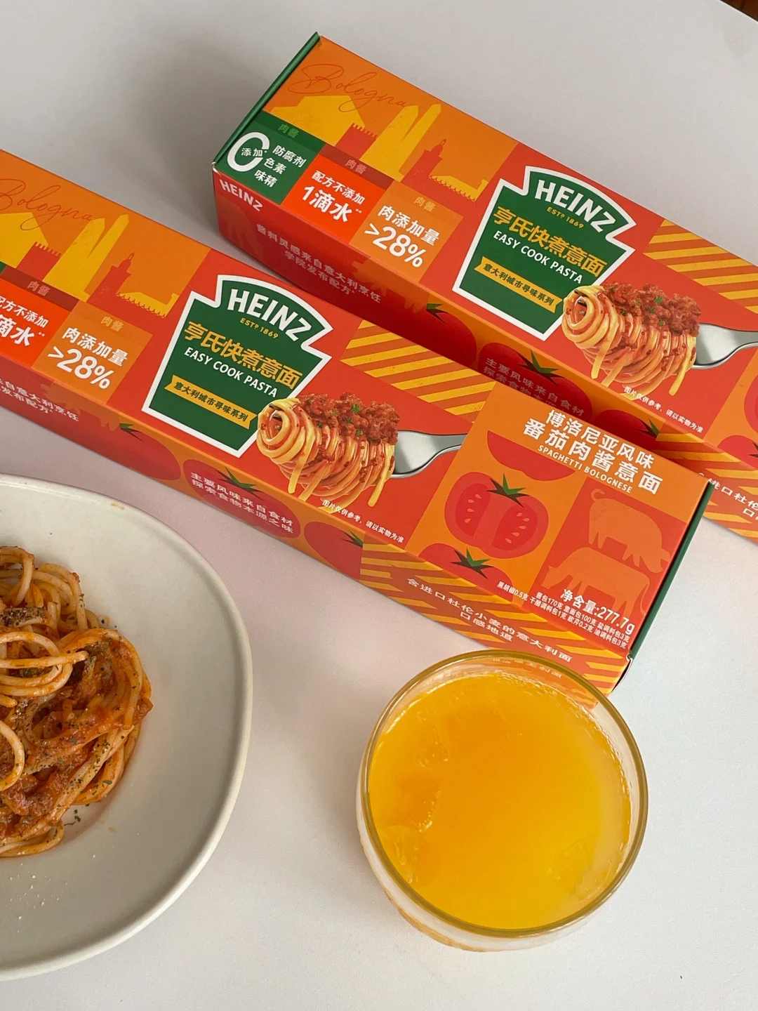 现在不用出门在家只要花上十分钟的时间就可以吃上一顿地道的博洛尼亚风味的番茄肉酱意面,足不出户就能享用餐厅级同款意面!亨氏这款意面在食材的搭配上真的是很用心!用的是猪牛混合的大肉粒和真实番茄熬制出来的肉酱,不添加一滴水,口感和香味真的敲浓郁,170g一大包的酱料能保证每根意面上都裹上满满的番茄肉酱。而且这款意面的配料表也很干净0添加防腐剂味精,好吃健康!对百年品牌的品控和品质是妥妥的放心!