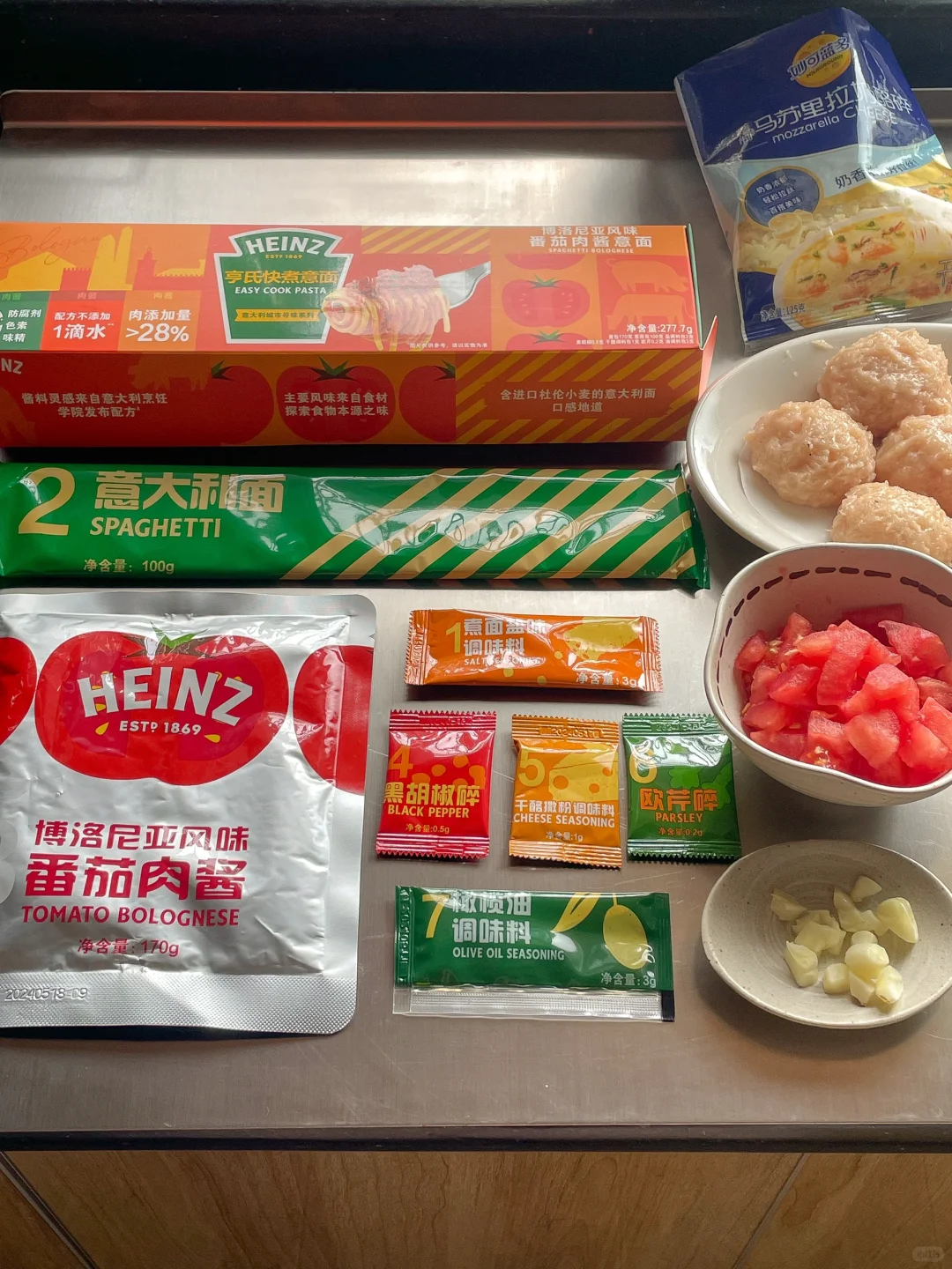 材料:亨氏番茄肉酱意面、番茄、鸡胸肉、马苏里拉芝士
