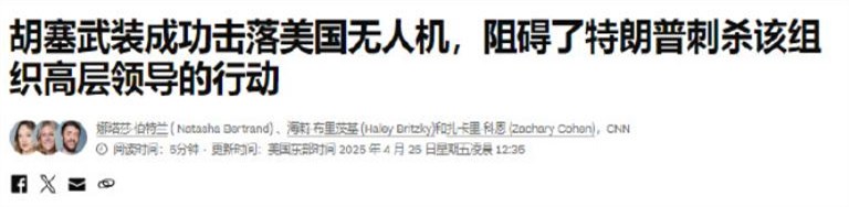 美国有线电视新闻网(CNN)在一篇文章中嘲讽特朗普,近三个月的交战,胡塞武装的指挥体系几乎完好无损,胡塞武装控制区的防空系统也没有遭到削弱,更没有“斩首”该组织的高层人员……相反,美军却白白浪费掉大量弹药,损失了20多架MQ-9“死神”无人侦察机。