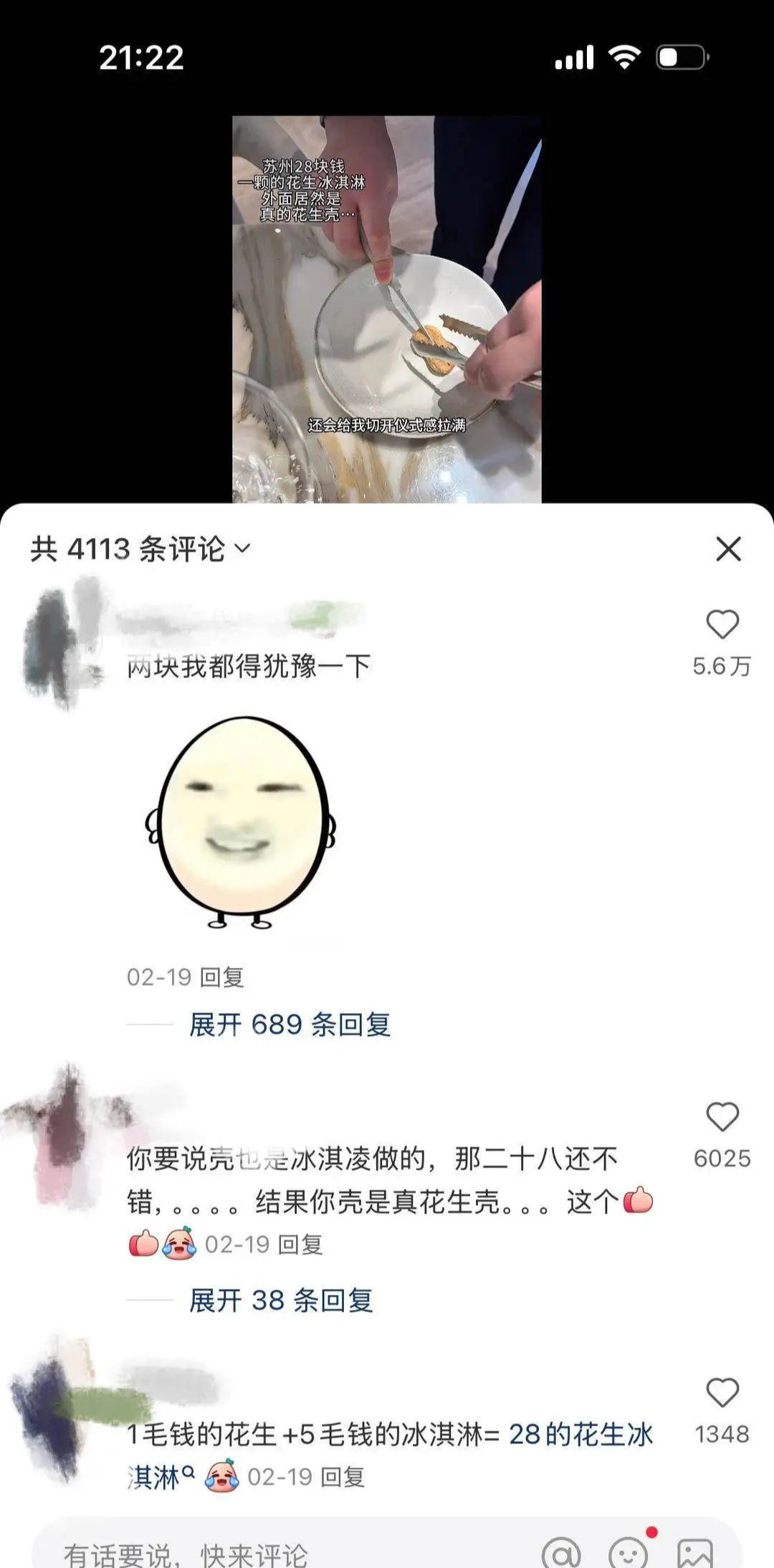 最近,苏州一家餐厅的“花生壳冰淇淋”成了网络热议的焦点。一位女士吐槽,这装在真花生壳里的冰淇淋卖到28元一个,分量却少得惊人。虽然服务员会帮忙切开,仪式感十足,但实在不值这个价。不少网友也纷纷调侃:“吃完难道还得嗦壳?”