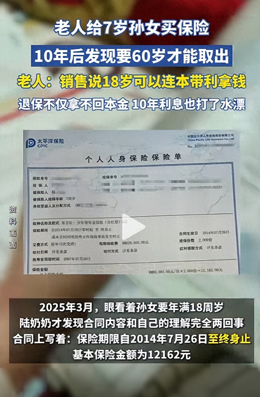 我们现在还能相信保险吗?江苏杭州的陆奶奶给7岁的孙女买保险,当时销售员承诺,到孩子18周岁就可以连本带利的取出。并且利息不菲,10年过去了孙女已经17岁了,老人本想终于把10年的钱全部拿回来了,没想到打开合同一看,原来合同上写的是“终身”。就是说,要孩子到了老年才能全部取出。可现在孩子17岁,那要等猴年马月去了?我们来看看到底是怎么回事?