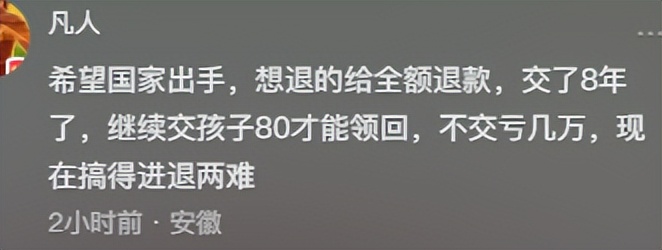 网友B:希望国家出手,想退的给全额退款,交了8年了,继续交孩子80才能领回,不交亏几万,现在搞得进退两难