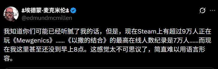 而他的新作《喵喵的结合》在2月10日正式发售时,仅凭“结合”二字,市场的反应比任何宣传都要直接有力。根据官方公布的数据,游戏在上线仅仅三小时内就收回了全部开发成本,8天销量突破了一百万份,Steam同时在线人数也一度超越前作“以撒”。