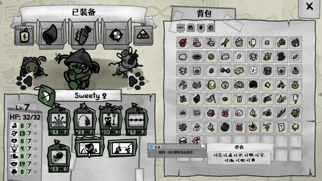 从玩法类型来看,《喵喵的结合》做出了一个大胆的转变。相比前作《以撒的结合》的动作射击模式,新作选择了战棋与Roguelike的融合。这种转变意味着游戏的核心体验从反应速度和手眼协调,转向了策略规划和资源管理。游戏的内容体量相当惊人,包含了超过九百种独特物品、两百多种敌人、近千种职业技能。每一项技能和物品都承担着构建玩家独特战斗策略的功能。就个人进度而言,即使已经投入了近五十小时时间,打通了2个大地图,其游戏进度可能也只完成了百分之三十左右。