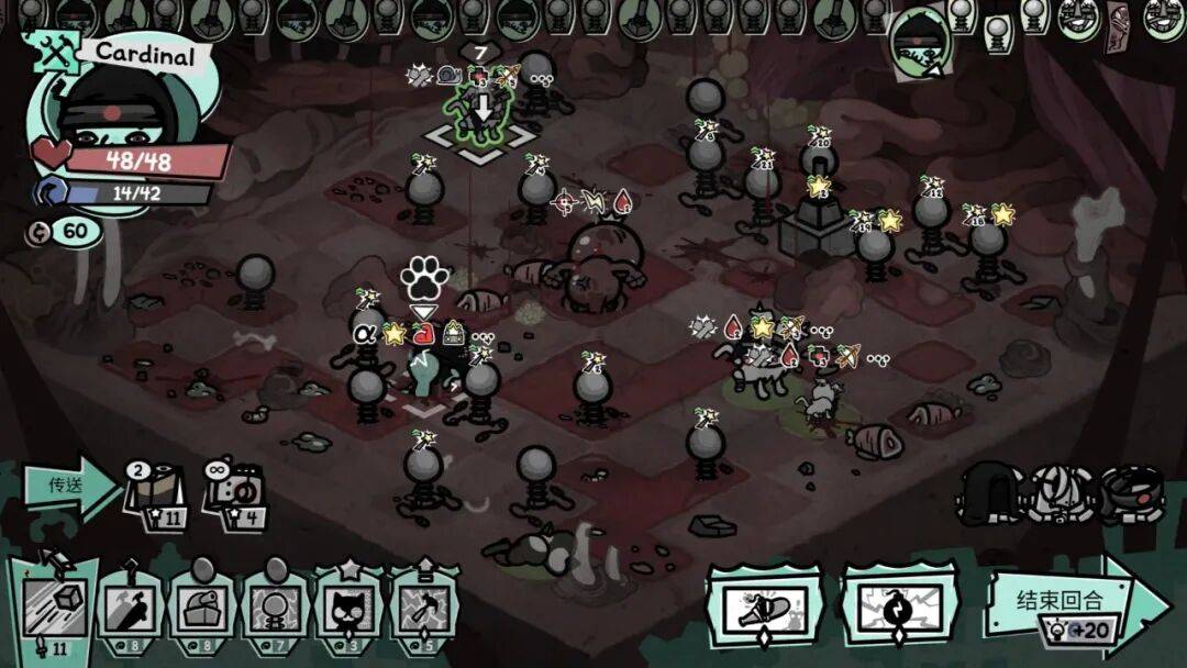 战斗系统采用回合制设计,但节奏相当紧凑。轮到猫咪行动时,它们可以移动、攻击和使用技能,直到普攻或者魔法值耗尽。敌人种类繁多,有些会伪装自己,有些会用各种不寻常的方式下毒、引诱或者削减玩家生命值,特别危险的敌人甚至会造成即死效果。如果敌人击败了一只猫咪,它会倒地并受伤,若不护住它的尸体,玩家就会永远失去这只猫咪。一次我自己召唤的“僵尸猫”就把队友尸体吃掉了,最后也只能是哑巴吃黄连,有苦说不出。