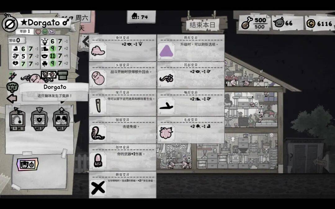 玩家需要精心管理繁殖过程,确保出生的小猫具有最佳特征,并保留获得的高质量突变。为了避免近亲繁殖导致的基因缺陷,玩家必须定期收养新的流浪猫。购买各种物品可以改善猫咪的情绪、繁殖欲望、健康状况和获得突变的机会。这些物品也会影响住房质量,从而吸引更多有能力的流浪猫前来投靠。