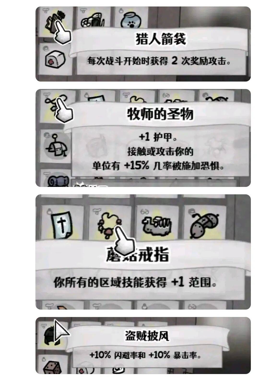 战斗结束后往往会掉落饰品,获得的饰品可以装备在猫咪身上,这些装备能够显著增强猫咪的特性并产生各种效果,增加盟友数量、改变主要攻击方式、召唤友好的苍蝇和蜘蛛、清除负面状态,或者施加正面增益。主动装备则主要用于治疗或造成伤害,比如切肉刀可以瞬间消灭普通敌人,对Boss也能造成重创。每次冒险结束后,参与战斗的猫咪都将退役,无法继续使用,这种设定确保了游戏的循环性。