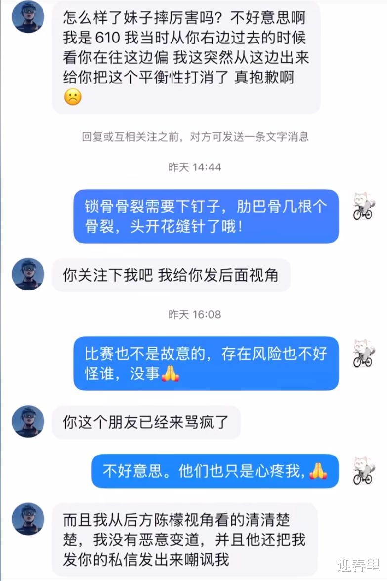 女子表示自己不是专业的车手,只是一位热爱骑行的爱好者,承认自己很菜,但不会故意卡位和别车,因为失去当时的记忆了,所以不好去解释自己当时的操作。