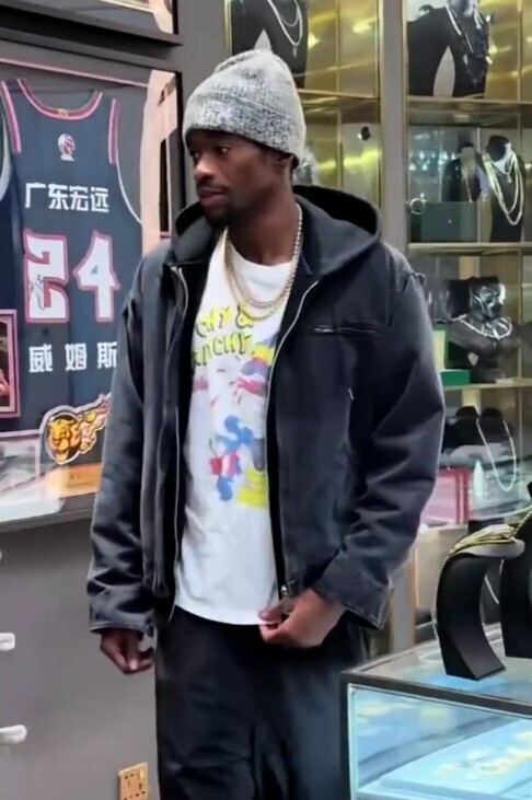 有媒体上传视频,画面中萨姆纳出现在某处珠宝店,他挑了一个金链子。只见服务员拿出金链子给萨姆纳戴上,他自己照镜子观看。