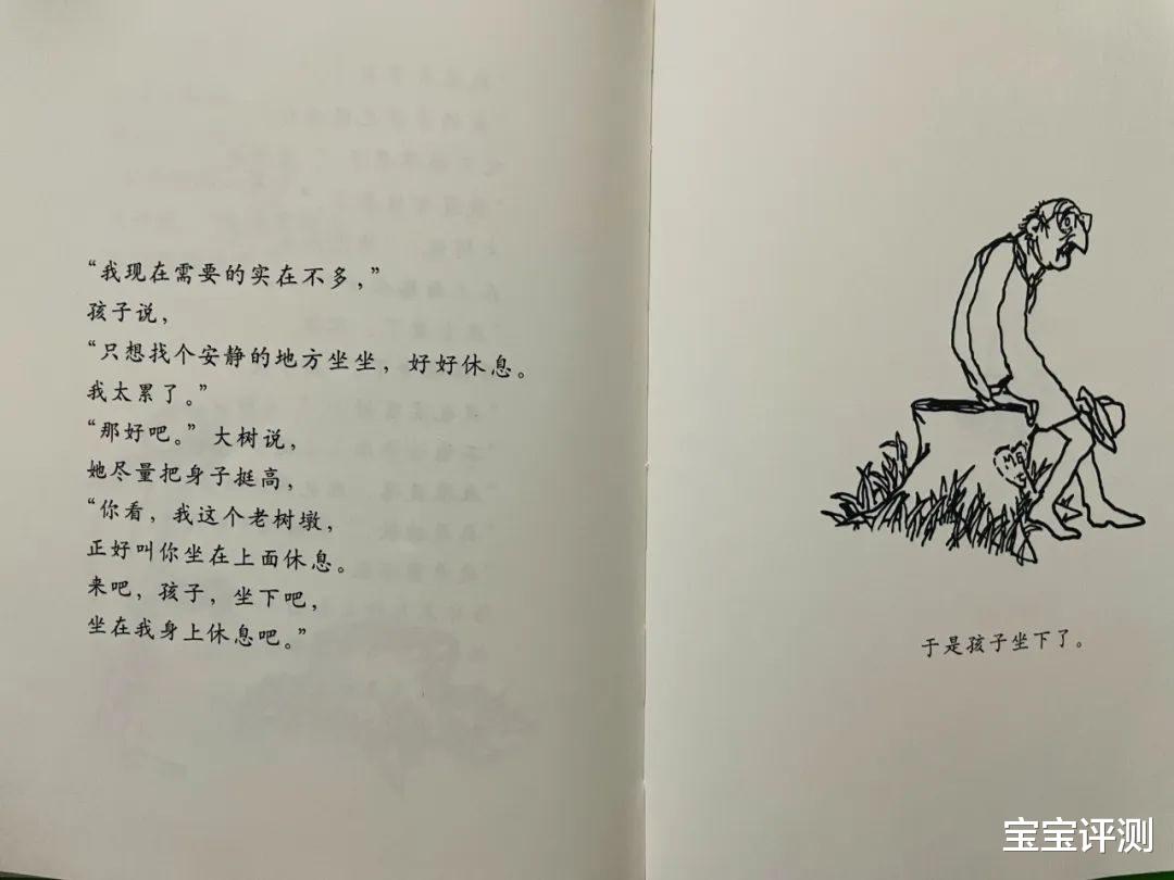“那好吧,”大树说,她尽量把身子挺高,“你看,我这个老树墩,正好叫你坐在上面休息。来吧,孩子,坐下吧,坐在我身上休息吧。”