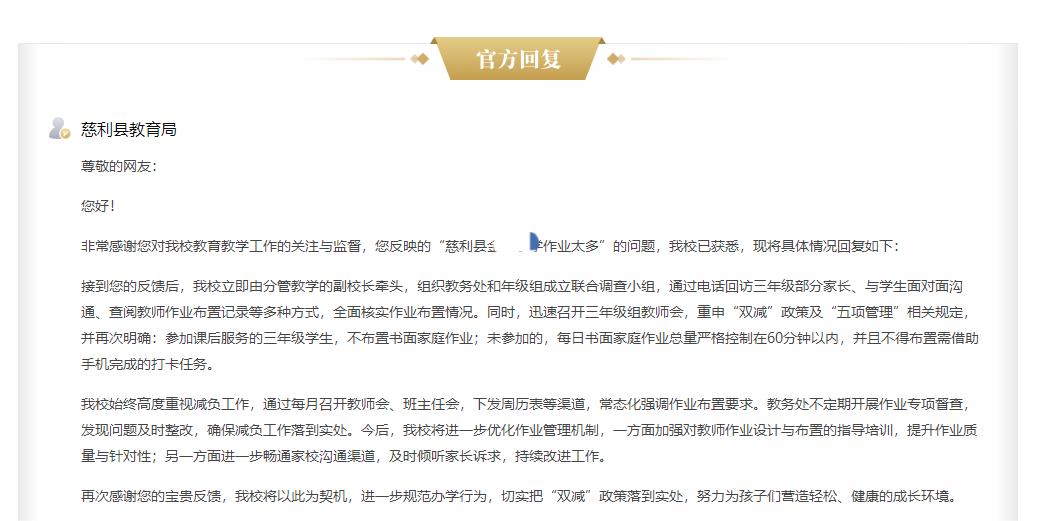教育局的回复,并未正面回应是否存在学生作业负担过多的情况,只是强调将遵循“双减”政策及“五项管理”等相关规定,同时承诺今后加强督促,进一步优化作业管理机制,以避免学生的作业负担过重。